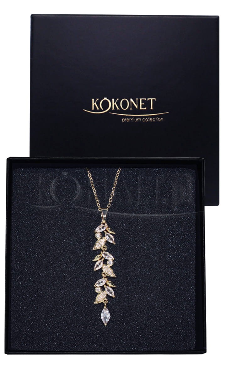Série FLORIS spojuje lístky a zirkonie - lehkost a přirozenost. Zlatý svatební náhrdelník s podlouhlým rostlinným přívěskem zdůrazní linii dekoltu a krásně zapadne do všech květinových akcentů svatebního outfitu. Barva světlého jemného zlata zahřeje pleť.