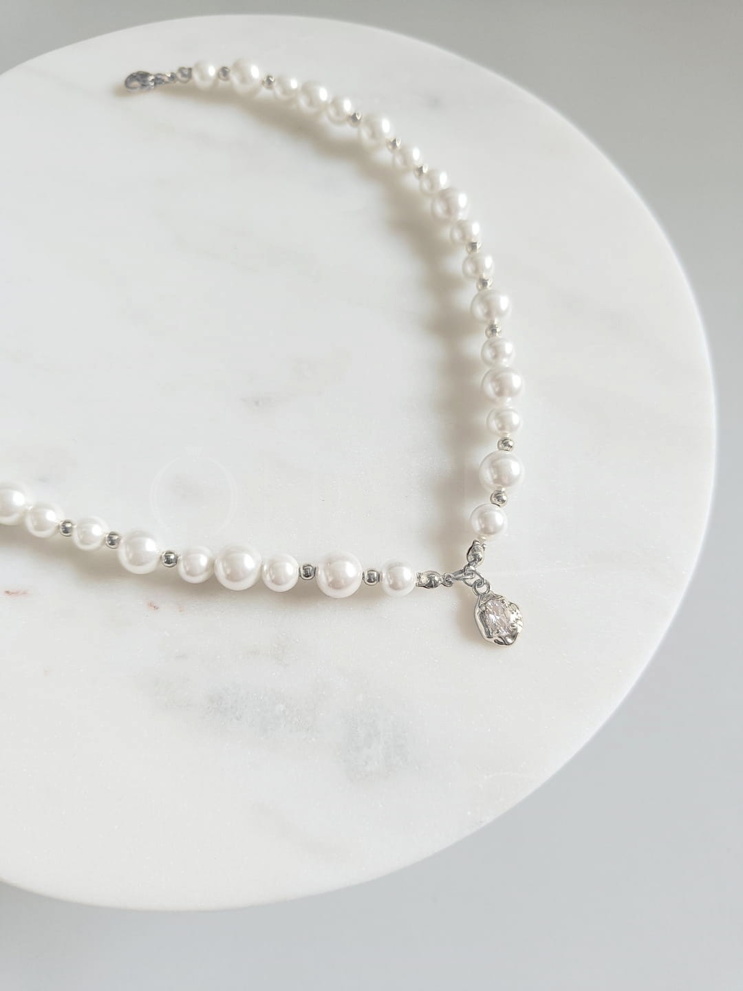 Náhrdelník je ruènì vyrábìn z mosazi pokovené rhodiem, nerezové oceli a moøských perel (seashell).