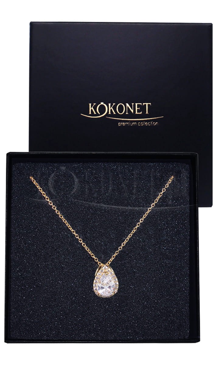 Zlatý svatební náhrdelník DROP gold je nejklasičtější model v naší nabídce. Díky své univerzálnosti se hodí do svatebních, večerních i méně formálních stylizací. Snadno k němu vyberete náušnice a náramek. Nadčasový tvar slzy zdobený kolem křišťálky již ohromil nejednu klientku.
