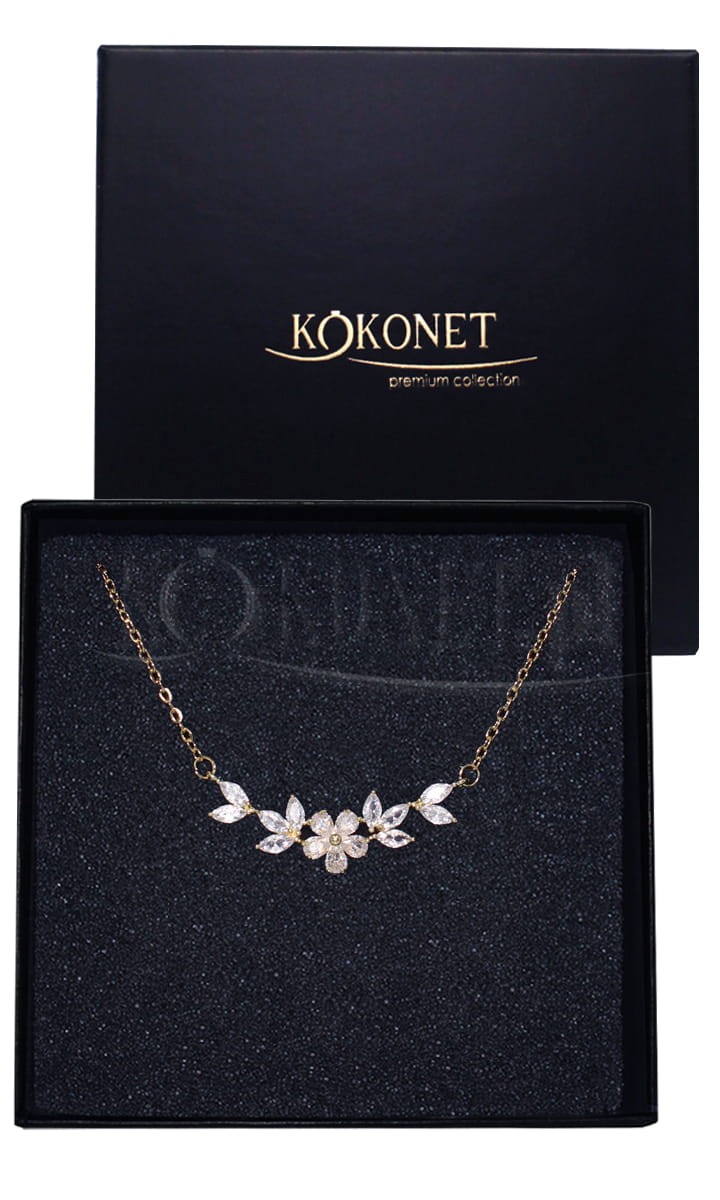 Hledáte zlatý romantický náhrdelník ke svatebním šatům? NANCY je pro vás - kubické zirkony tvořící tvar kvítku s lístky nádherně září a zdůrazňují jemnost a jedinečnost celého vzhledu.