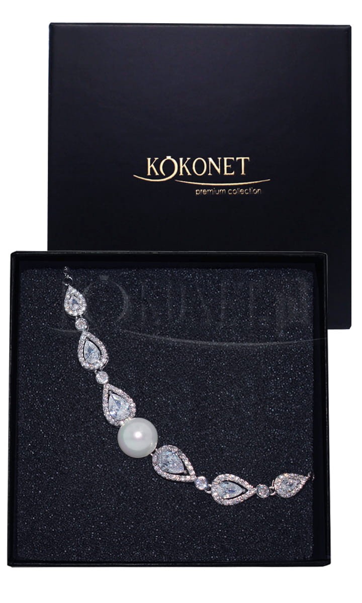 Klasická svatební bižuterie v podobě nastavitelné stříbrné náramkové bižuterie s perlami a slzami z cirkonií se osvědčí jako doplněk k elegantní svatební šatě. Díky nastavitelnosti ji snadno přizpůsobíte svému zápěstí.