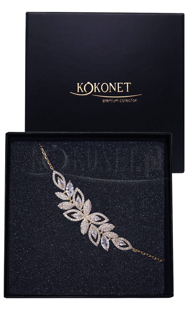 Dalma je příkladem jemné zlaté svatební náramkové bižuterie s motivem listů v provedení glamur. Bižuterie z této série převládá rostlinný motiv, který spojuje větší a menší zirkony, tvořící estetický celek. Na konci stránky naleznete perfektně přizpůsobený náhrdelník a náušnice.