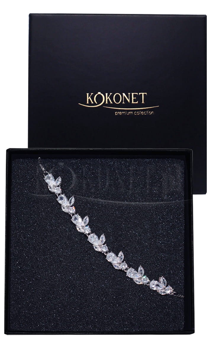 Elegantní stříbrný svatební náramek s motivem listů a slz. Naplní svatební vzhled září, a díky své jemné formě neodvede pozornost od ostatních prvků šatů, ale bude s nimi krásně ladit. Díky nastavitelné délce ji můžete přizpůsobit obvodu zápěstí. Podívejte se na konec stránky a přesvědčte se, ke kolika modelům náušnic se hodí.