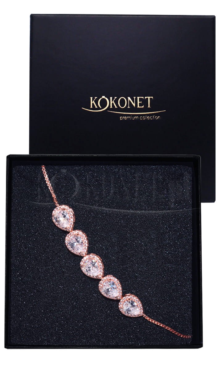Jemný a dokonale se přizpůsobující zápěstí náramek DROP v rámu teplého růžového zlata je řešením pro každou ženu, která ocení minimalismus. Diamanty broušené ve tvaru slzičky jsou univerzálním motivem. Nejčastěji je vybírána pro svatební styling.