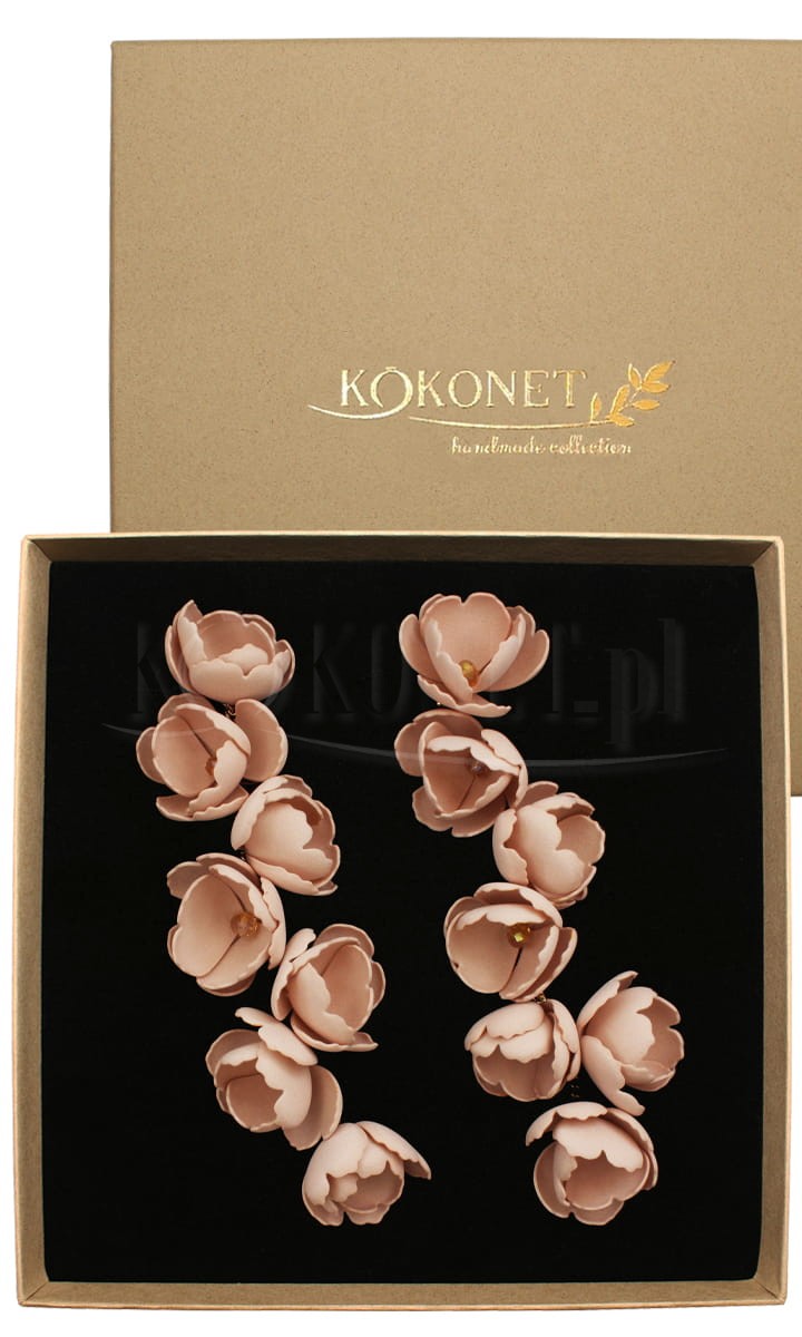 Dlouhé květinové náušnice jsou v současné době horkým trendem mezi doplňky. Náušnice LIDIA vznikly jako ztělesnění snů o girlandách květů zdobících uši. Květiny jsou jemné a ručně tvarované z pěny, díky čemuž je každý z nich zcela jedinečný. Lehké květinové náušnice v barvě cappuccino v zlatém rámu budou zajímavým a neotřelým šperkovým doplňkem.