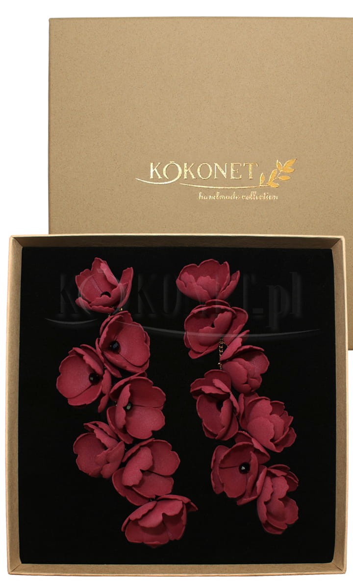 Dlouhé květinové náušnice jsou v současné době horkým trendem mezi doplňky. Náušnice LIDIA vznikly jako ztělesnění snů o girlandách květů zdobících uši. Květiny jsou jemné a ručně tvarované z pěny, díky čemuž je každý z nich zcela jedinečný. Lehké květinové náušnice v barvě borda v zlatém rámu budou zajímavým a neotřelým šperkovým doplňkem.