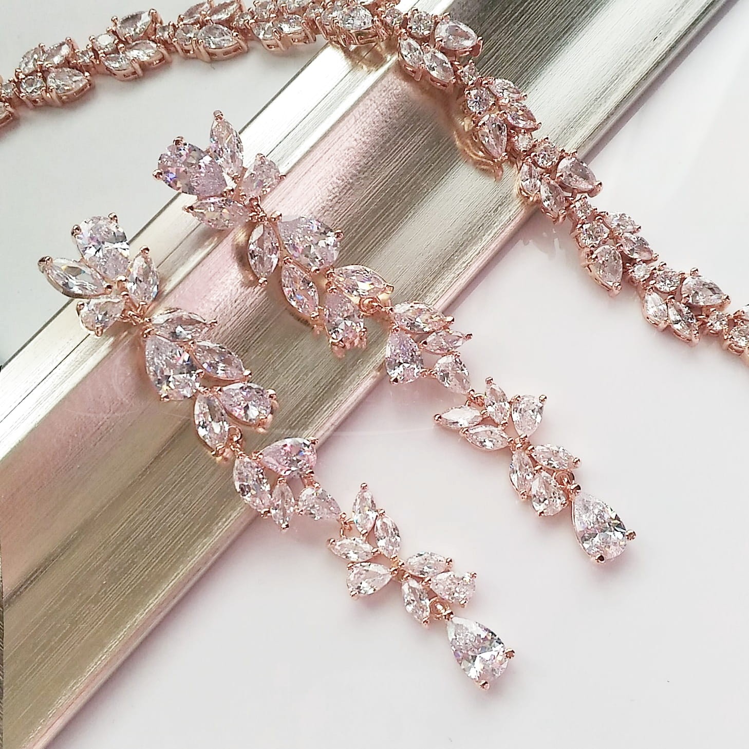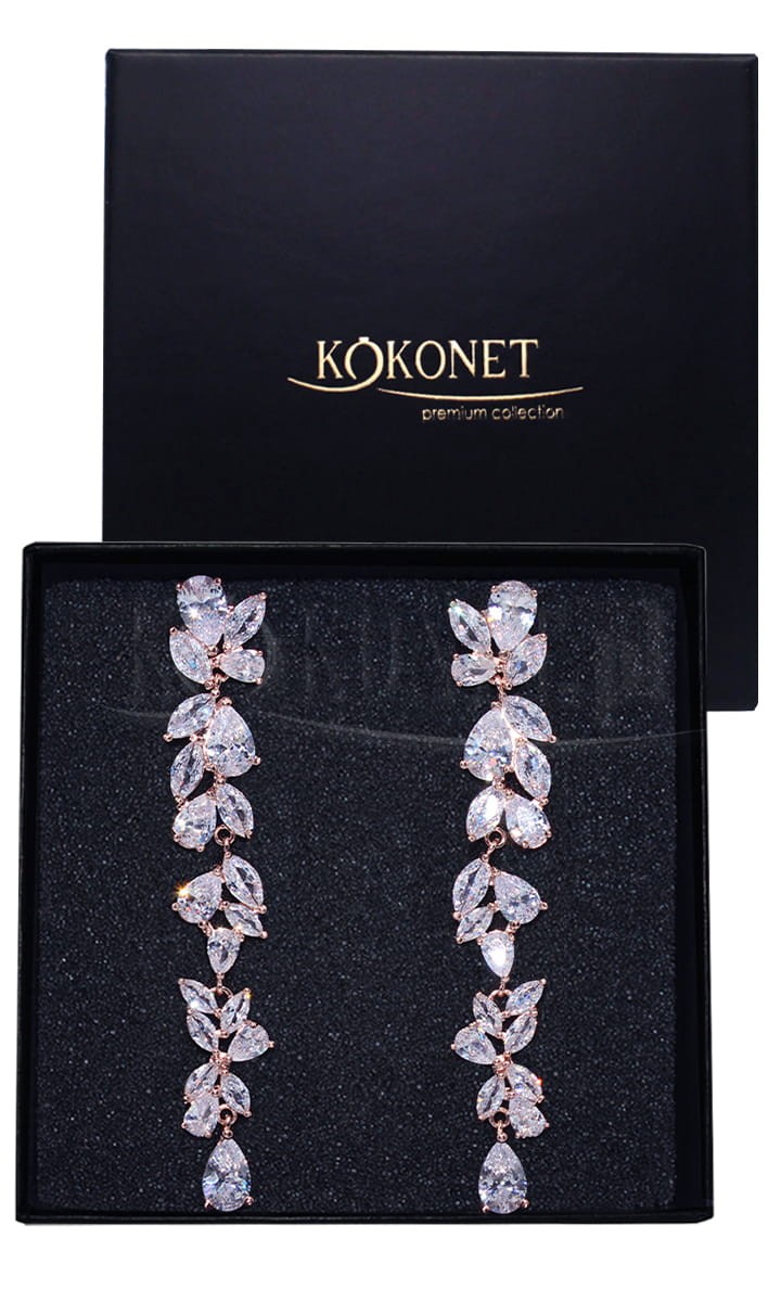 Jedny z nejdelších náušnic v naší nabídce. Docela nápadné a dlouhé svatební náušnice v barvě rose gold, které krásně září, zdůrazňují krásu. Blanca jsou rozhodně náušnice pro milovnice zdobené svatební bižuterie.