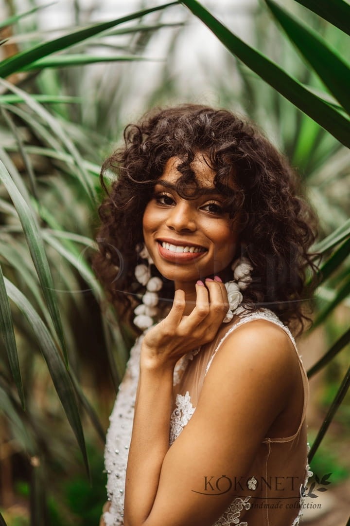 Dlouhé svatební květinové náušnice jsou v současné době nejčastějším výběrem nevěst. Náušnice LIDIA vznikly jako ztělesnění snů o lehkých květinových girlandách zdobících uši. Květiny jsou jemné, ručně tvarované a zavěšené na řetízku, aby se mohly lehce houpat spolu s tělem.