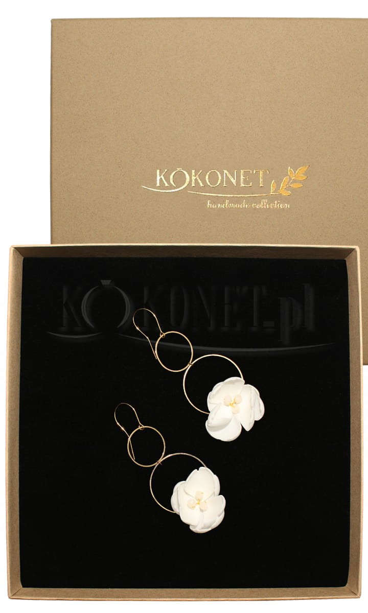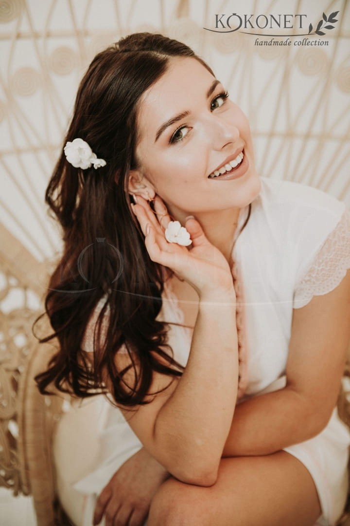 Jemné náušnice ve tvaru kruhu s květinami jsou častou volbou nevěst. Svatební náušnice v tomto provedení jsou lehké, pohodlné a díky ručně formovaným květům zdůrazňují individuální charakter svatebního stylu.
