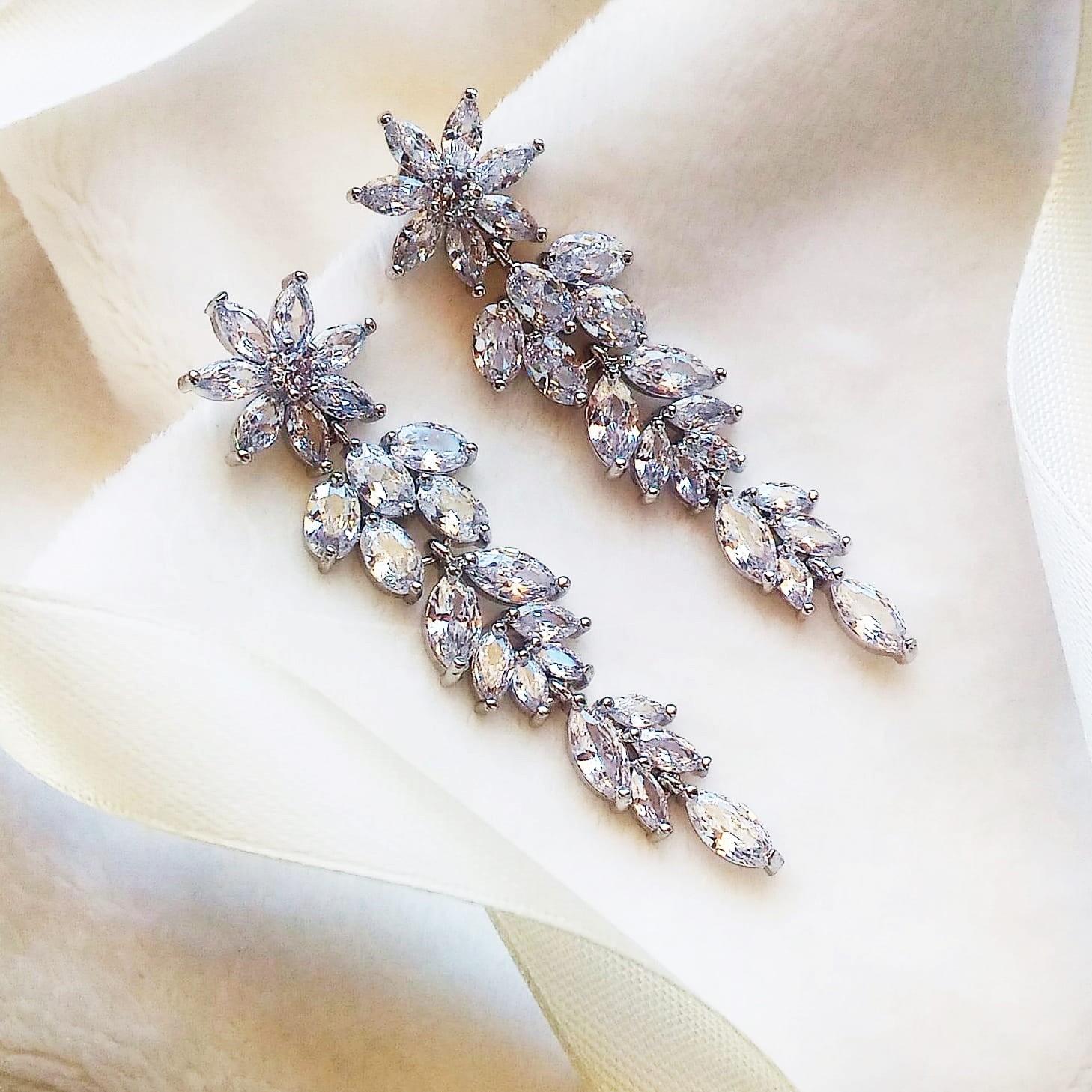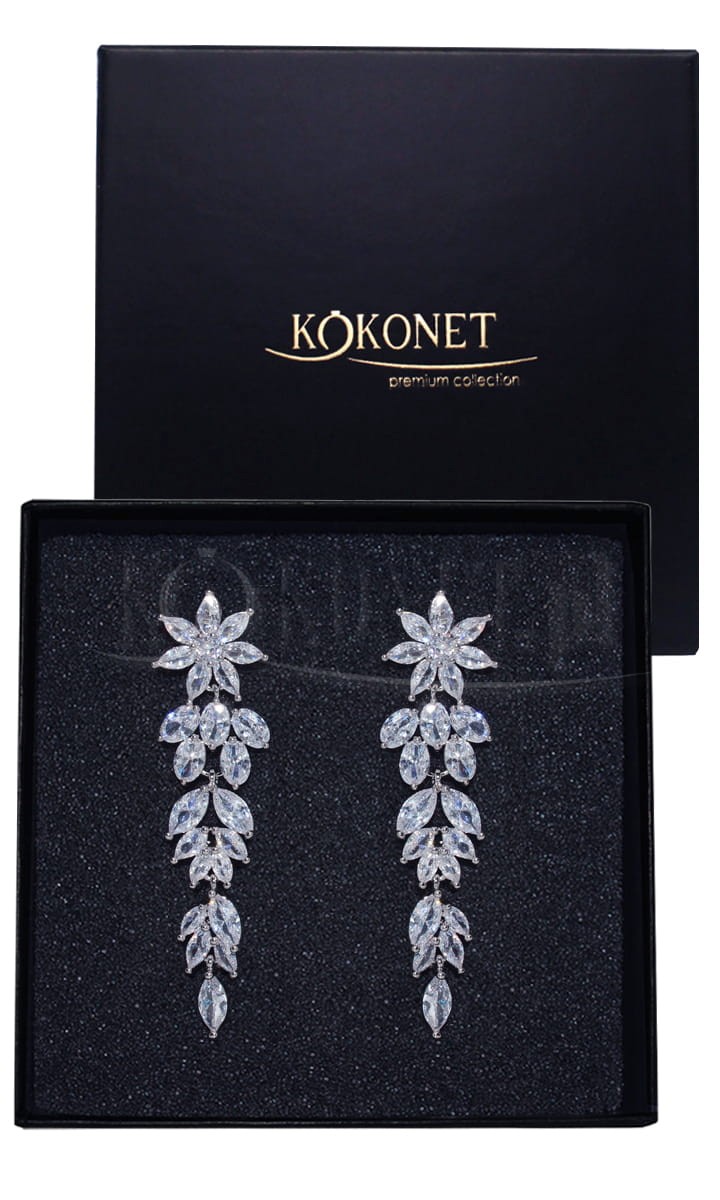Svatební stříbrné květinové náušnice MOREE jsou střední délky, velmi lehké náušnice v rostlinném stylu. To je způsobeno zirkonovým květem v části zapínání a kaskádovitě uspořádanými padajícími lístky. Skvěle ladí s rustikálním stylem.