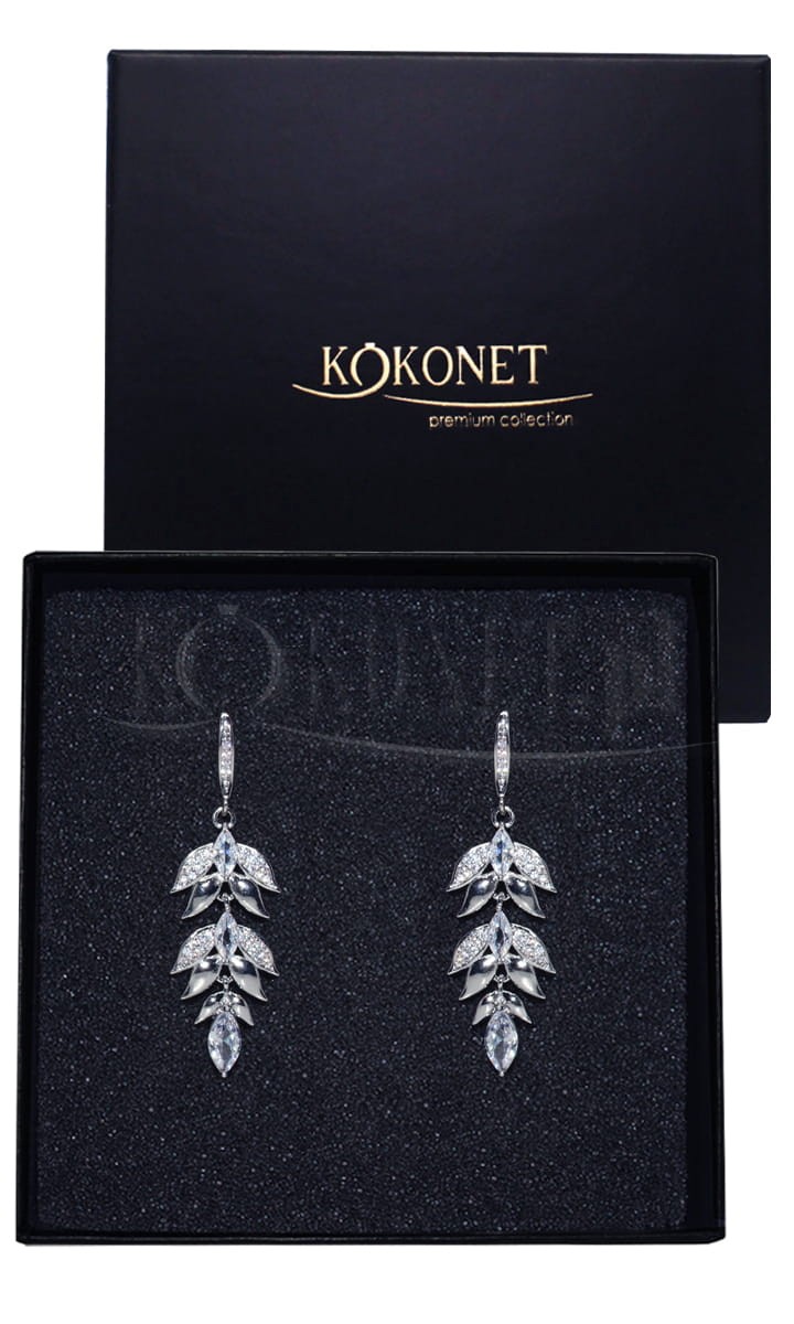 Malé stříbrné svatební náušnice GRAPEA jsou spojením elegantního stylu glamuru s romantickým motivem boho. Stříbřité lístečky střídavě s lístečky zdobenými zirkony a celými zirkony ve tvaru listů tvoří neobvyklé spojení. Náušnice se zapínají na otevřený bigl a krásně ozdobí uši v den svatebního dne, a po něm mohou sloužit i na další příležitosti. Budou viditelné jak při vybrání účesu, tak při subtilně rozpuštěných vlnách, a hlavní motiv bude ladit jak k krajkovým aplikacím, tak k úplně hladkým svatebním kreacím.
