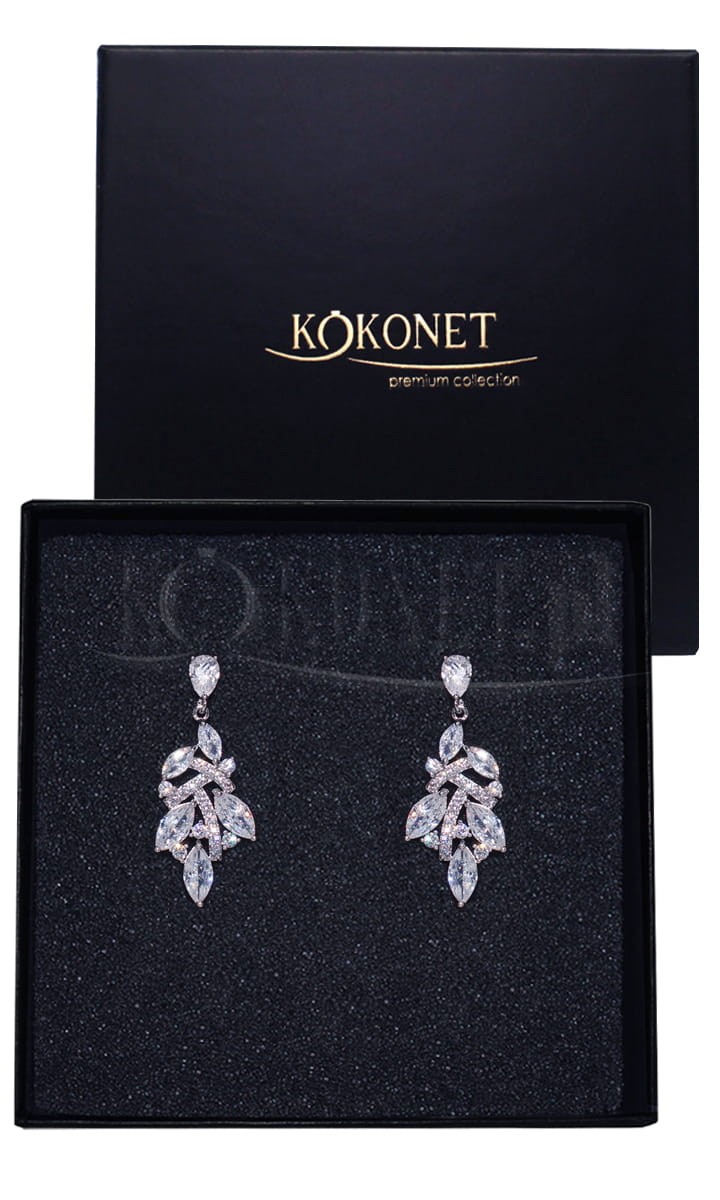 Středně dlouhé visící svatební náušnice a další elegantní příležitosti. Uspořádání náušnic umožňuje, aby byly viditelné jak při stažených vlasech, tak při rozpuštěných vlnách.