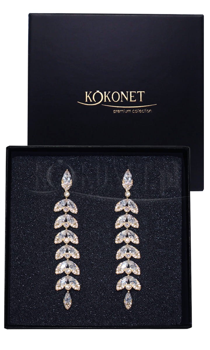 Náušnice VERONA jsou docela impozantní a určitě upoutávající pozornost. Lesklé zlaté svatební náušnice v tomto provedení září ve spojení s rustikálními lístečky, které jsou hlavním motivem tohoto vzoru. Věnujte pozornost umístění zirkonů v tomto modelu - hlavní zirkon v jednotlivých lístcích kolem je obklopen řadou drobných zirkonů, což zvyšuje odraz světla. Korzetové svatební šaty, svatební šaty s květinami nebo svatební šaty ve stylu imperiálním - k nim budou naše dlouhé svatební náušnice skvělým doplňkem.