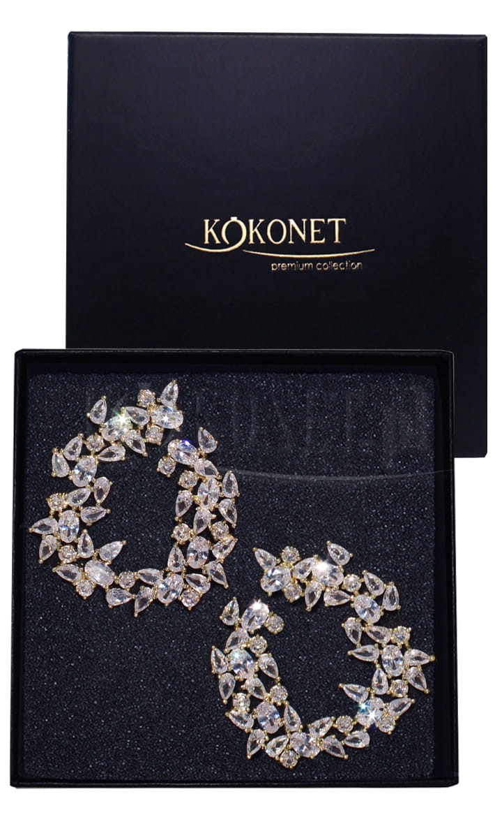 Efektní zlaté náušnice zdobené zirkony s kubickým brusem krásnì odrážejí svìtlo a dodávají stylu úžasný charakter. Je to ideální volba pro nevìstu, která sní o spektakulárním a zároveò romantickém šperkovém akcentu ve svatební den.