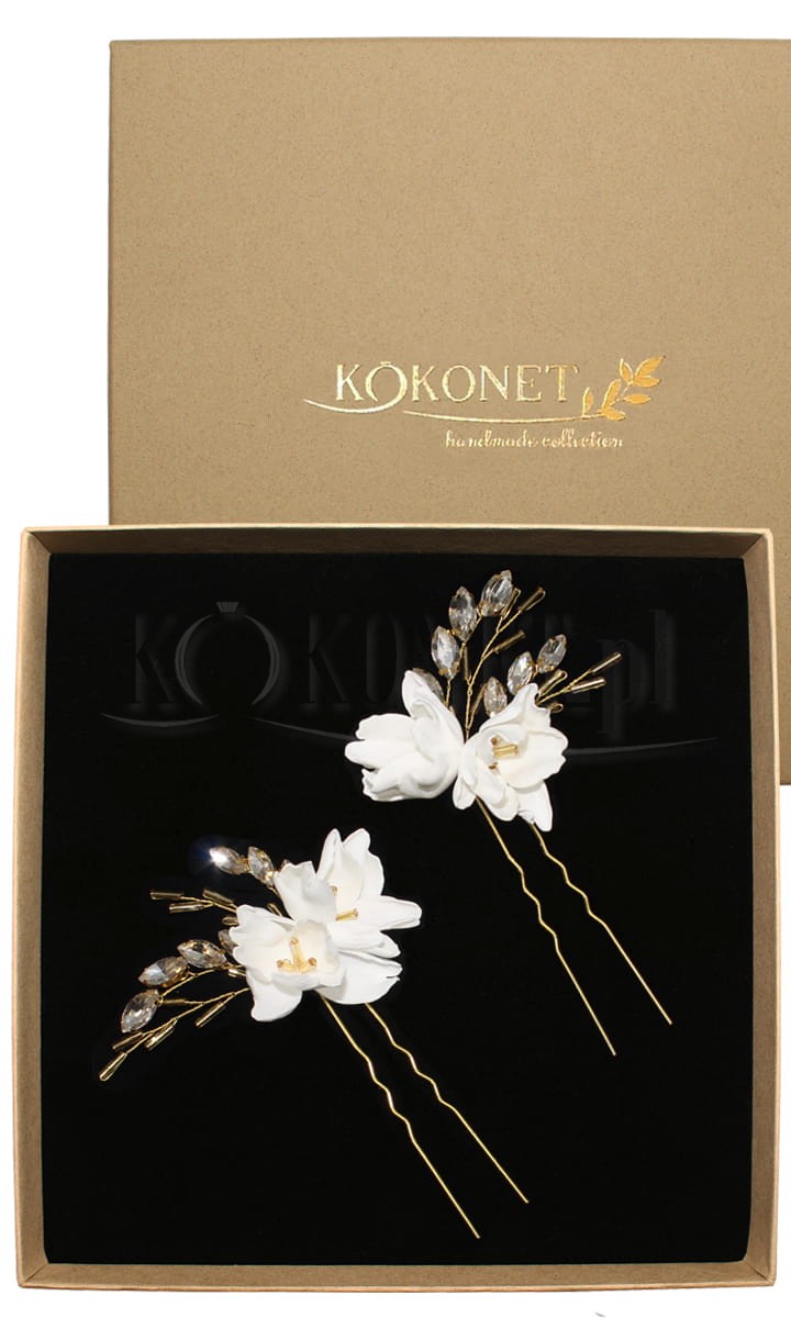 Květinové špendlíky do vlasů FRESJA gold jsou další květinovou ozdobou do vlasů - tentokrát ve verzi s krystaly a zirkony. Trochu lesku, který se bude prolínat mezi okvětními lístky květin, ještě více zdůrazní výjimečnost vašeho účesu a přitáhne pozornost. Ozdobné větvičky lze libovolně tvarovat, protože jsou vyrobeny z pružného drátu.