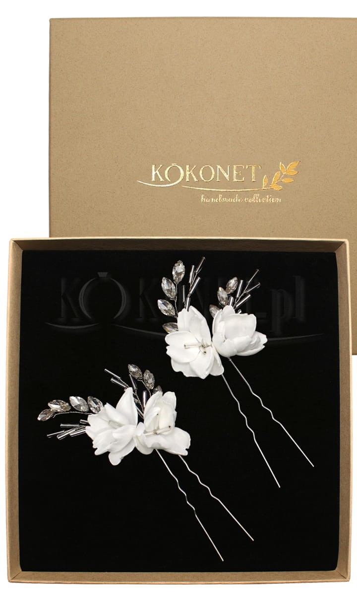 Květinové sponky do vlasů FRESJA silver jsou dalším květinovým návrhem vlasových ozdob - tentokrát ve verzi se zirkony a krystaly. Trocha lesku, která proniká mezi okvětními lístky, ještě více podtrhuje jedinečnost stylizace a přitahuje pohledy. Ozdobné větvičky můžete libovolně upravovat, protože jsou vyrobeny z pružného drátku.