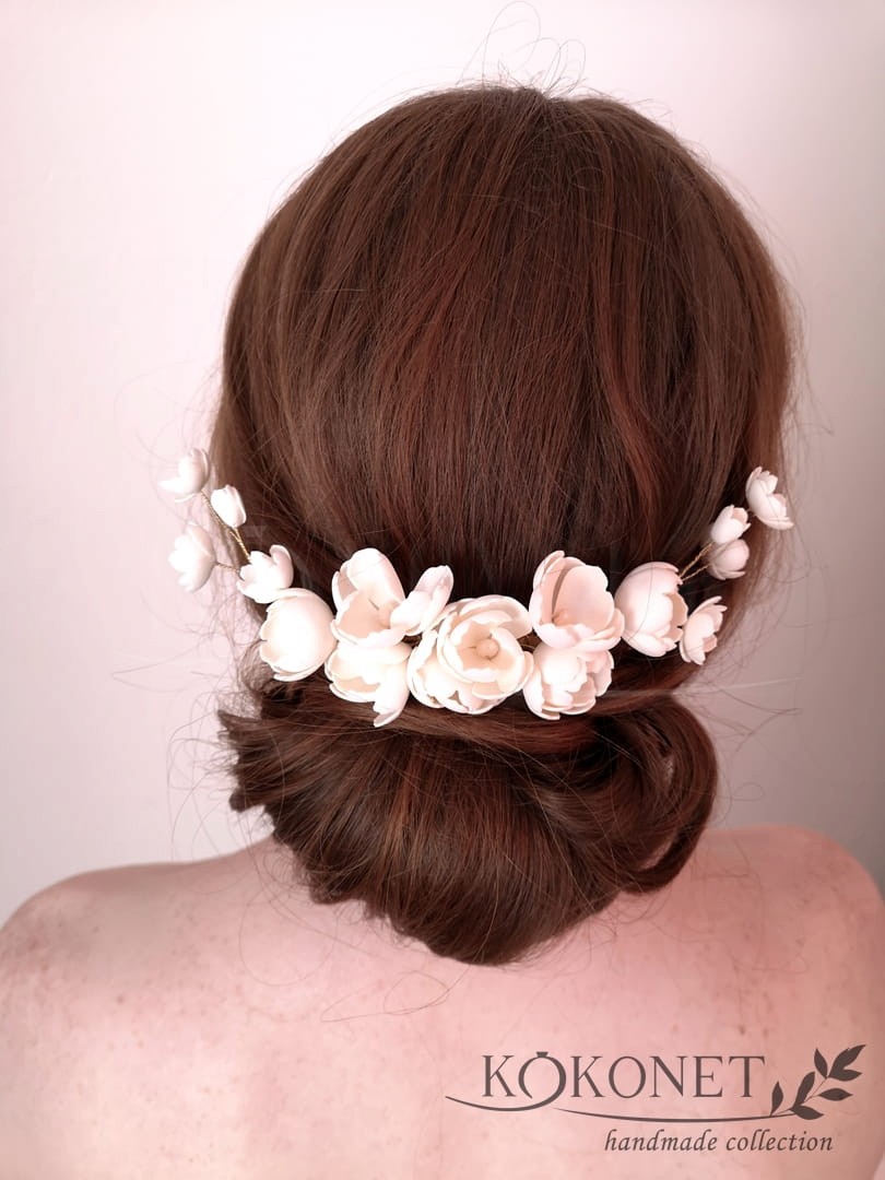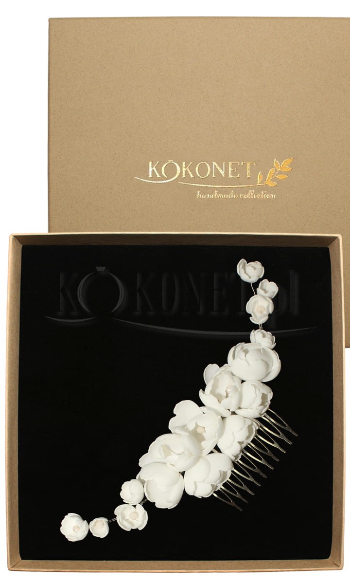 Hřebík LIDIA je návrh na květinovou ozdobu pro svatební vlasy, především určený pro nízké upínané účesy nebo rozpuštěné vlasy. Hřebík je zdoben květy ve tvaru pivoňky, které jsou často volbou pro svatební kytice. Určitě zdůrazní a doplní každý romantický svatební styl s květinovým motivem.
