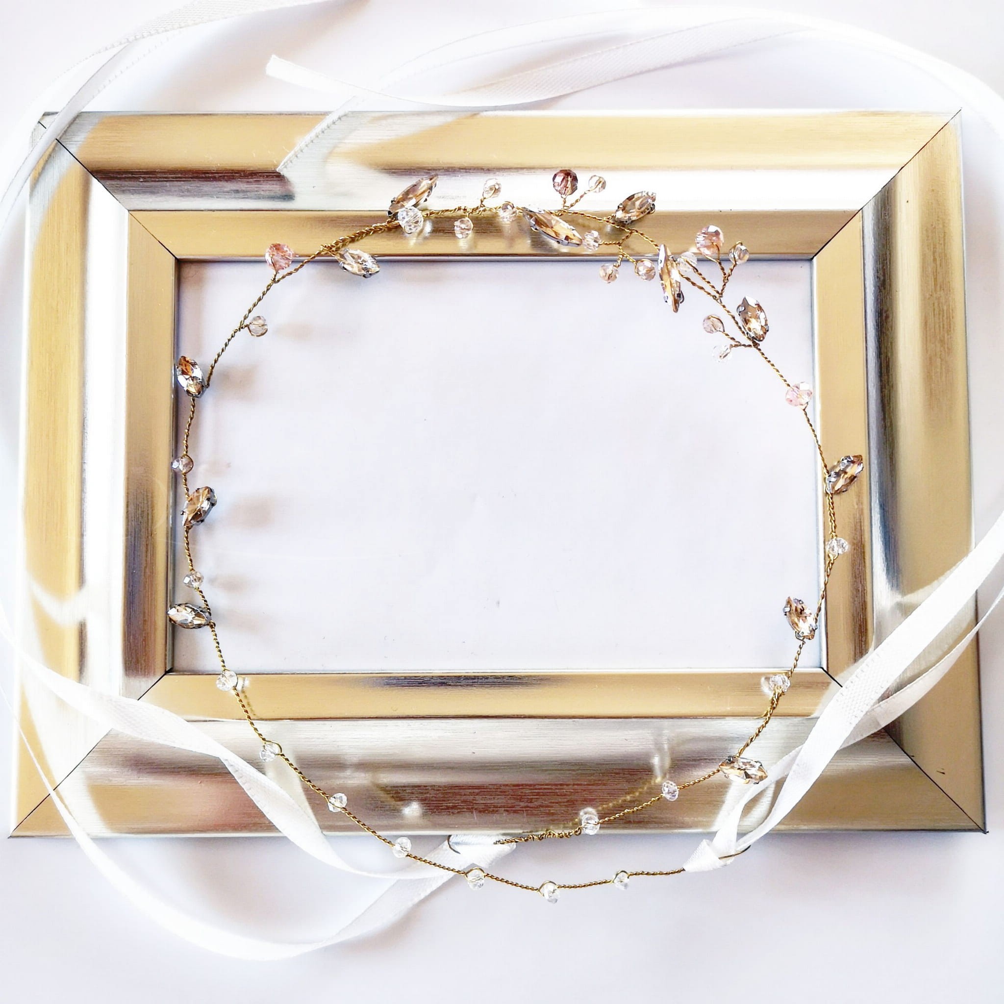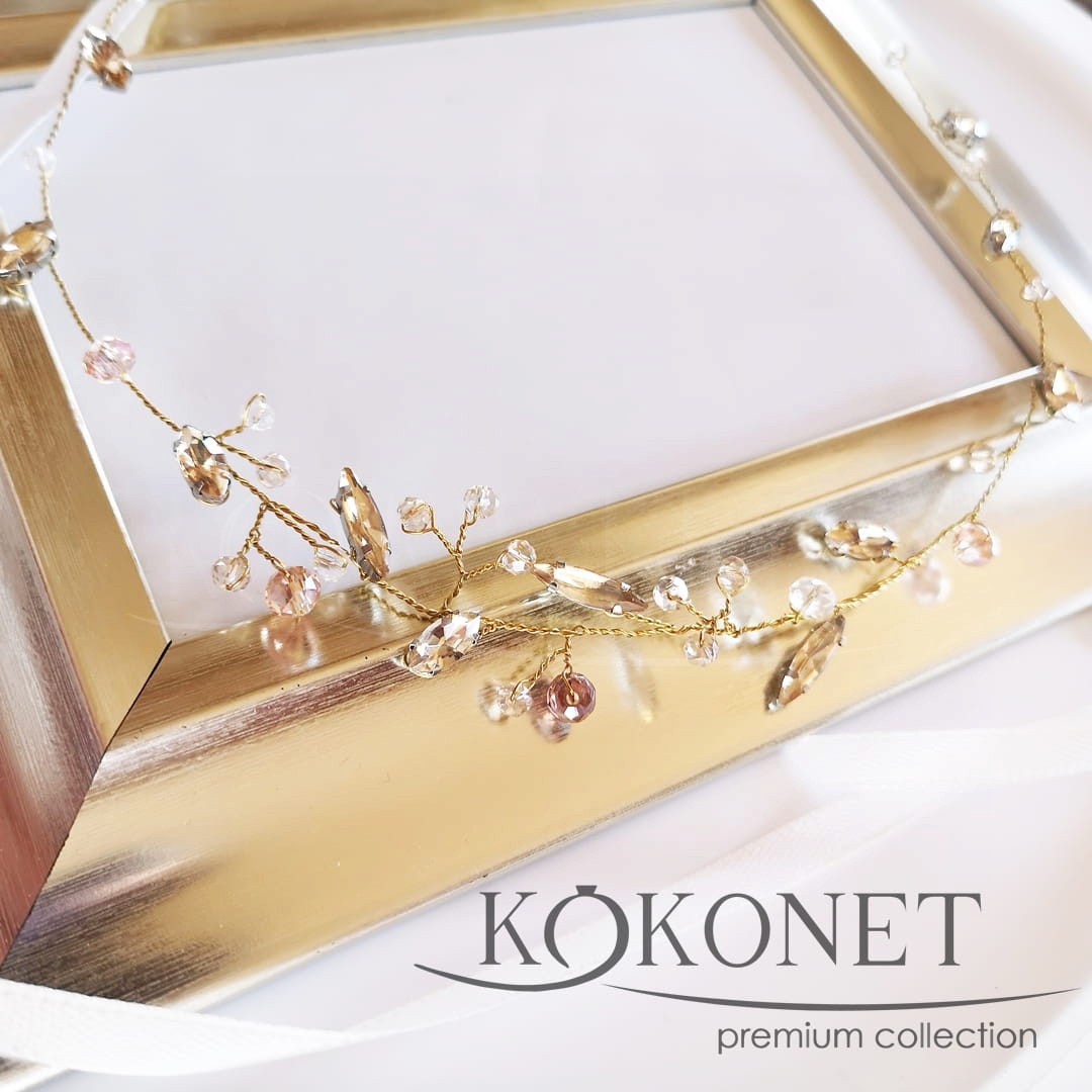 Věnec ADRIEN byl vytvořen s ohledem na nevěsty, které rády třpytí. Asymetrická hustota zirkonů dělá ozdobu jemnou, ale stále jí nechybí lesk. Použity jsou v ní křišťálové kamínky v barvě šampaňského a různobarevné korálky, spletené zlatým elastickým drátkem - pokud potřebujete pouze průhledné korálky nebo jinou barvu drátku, kontaktujte nás - domluvíme se na detailích.