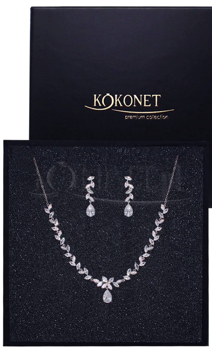 Tento efektní stříbrný svatební šperkový set, obsahující ozdobný, nastavitelný náhrdelník a odpovídající jemné náušnice, bude ideálním doplňkem rustikálních šatů. Pokud je vaše róba ozdobena efektními květinovými aplikacemi, neváhejte se rozhodnout pro tento set.