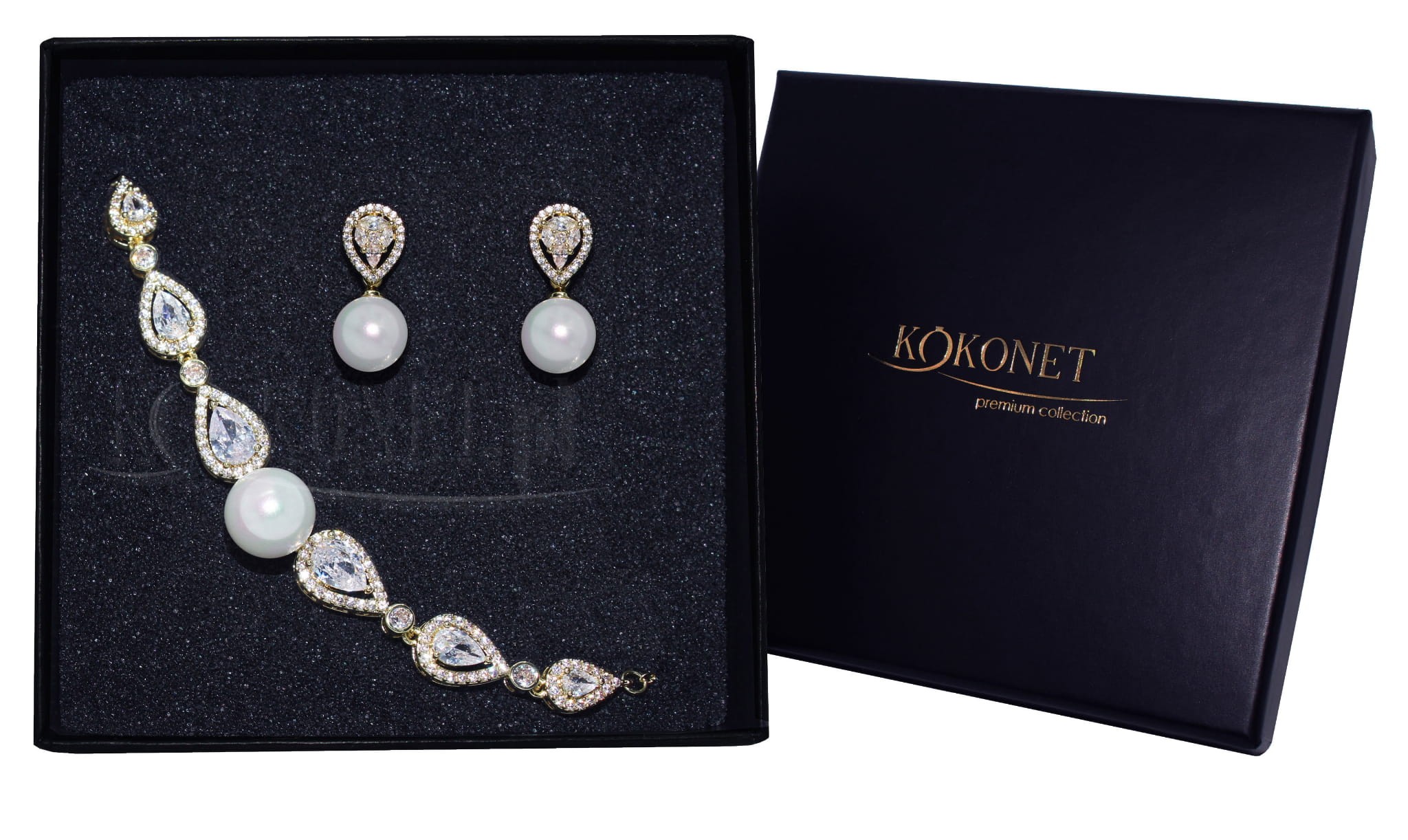 Elegantní set zlaté svatební bižuterie s perlami a zirkony ozdobí každou klasickou svatební stylizaci a nejen tu. Náušnice a náramek jako ideálně sladěný set můžete nosit bez problémů k malé černé, stejně jako na vlastní svatbu.