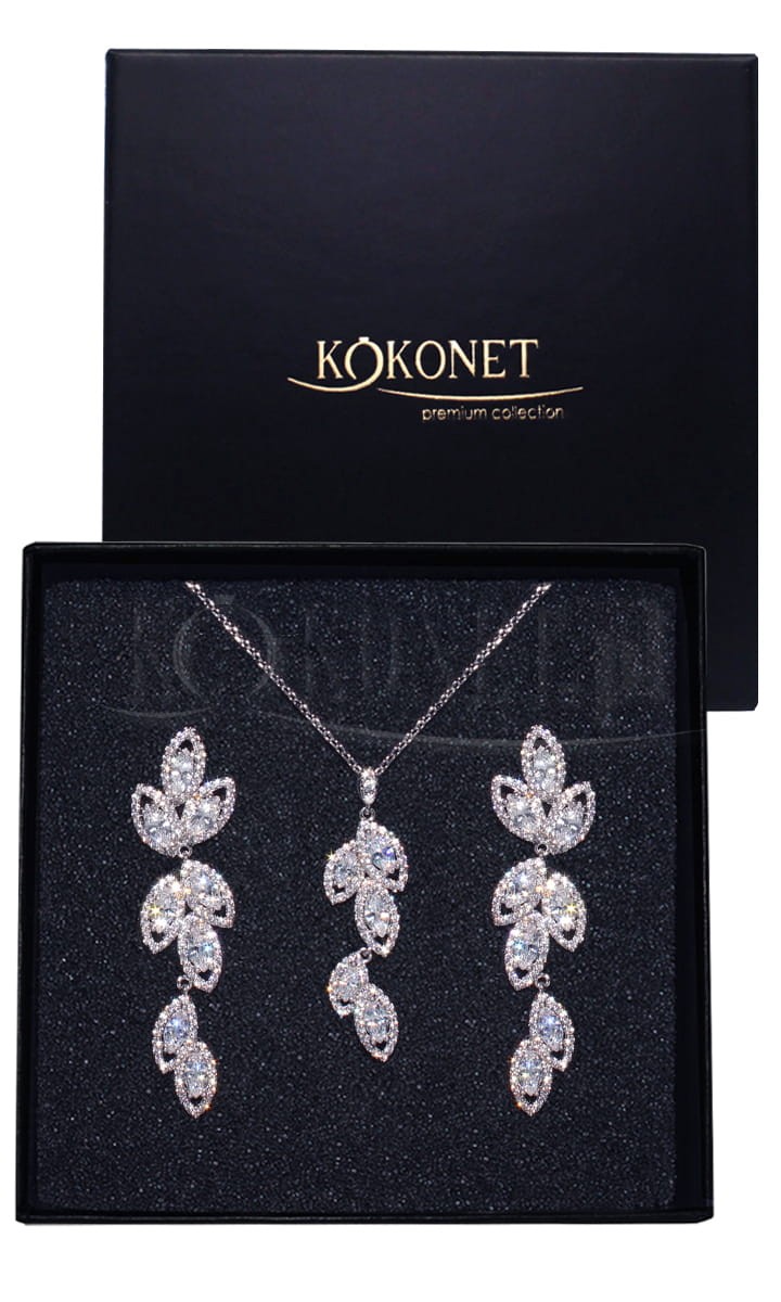 Pøidejte tøpyt nejdùležitìjším okamžikùm díky našemu výjimeènému støíbrnému svatebnímu šperkovému setu. Tento jemný set, skládající se z náhrdelníku a náušnic, okouzluje rostlinným designem s motivem lesklých lístkù. Preciznì zasazené zirkony nádhernì odrážejí svìtlo a vytváøejí efekt „wow“ pøi každém pohybu. Je to ideální svatební šperk s lístky, který dokonale doplní šaty v klasickém, boho i glamour stylu.