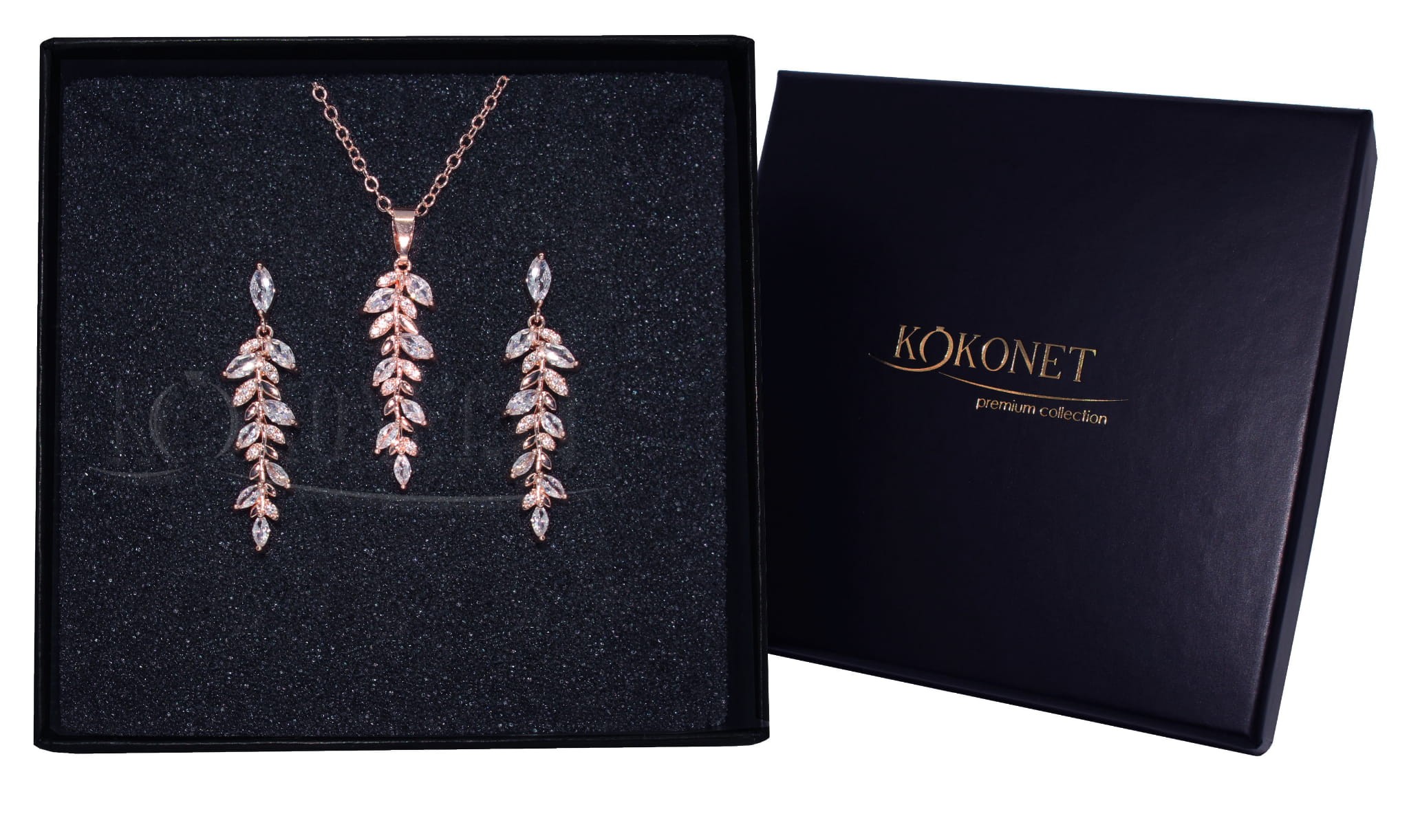 Jemný svatební bižuterní set s listy ozdobí svatební stylizaci a zdůrazní její přirozenost. Elegantní svatební náušnice rose gold s krásně sladěným boho náhrdelníkem v sadě budou představovat moderní a lesklý sadu bižuterie na svatbu.
