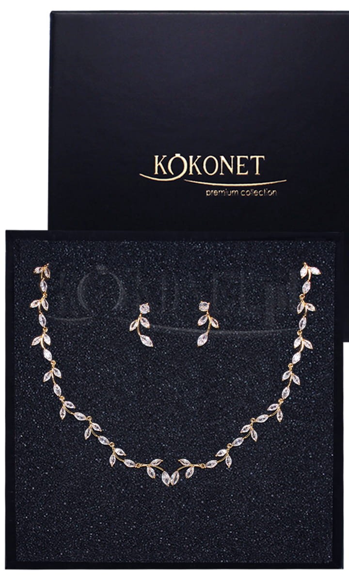 Sada zlatých svatebních šperků s motivem lístků je velmi jemná a určená k doplnění svatebních šatů ve stylu boho a rustikálním. Perfektně sladěná svatební souprava s náhrdelníkem a náušnicemi by měla být doplňkem, který nebude ani příliš výrazný, ani příliš nevýrazný. Sada BLIS je v tomto ohledu velmi univerzální – dodá jemným svatebním šatům lesk a ty honosnější dokonale doplní díky četným, krásně se třpytícím zirkonům.