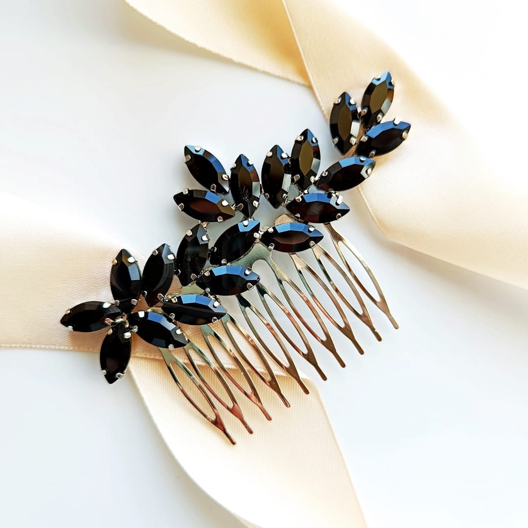 Ozdobný stříbrný hřeben s motivem černých zirkonových lístků bude díky své univerzálnosti vhodný pro mnoho večerních stylizací. Ozdoba je poměrně tuhá, takže se nemusíte bát, že změní svůj tvar během bláznivé zábavy na parketu. (Na fotografii se zlatá stuha odráží od zrcadlového povrchu hřebínku, proto se zdá, že je zlatý - základna ozdoby je stříbrné barvy)