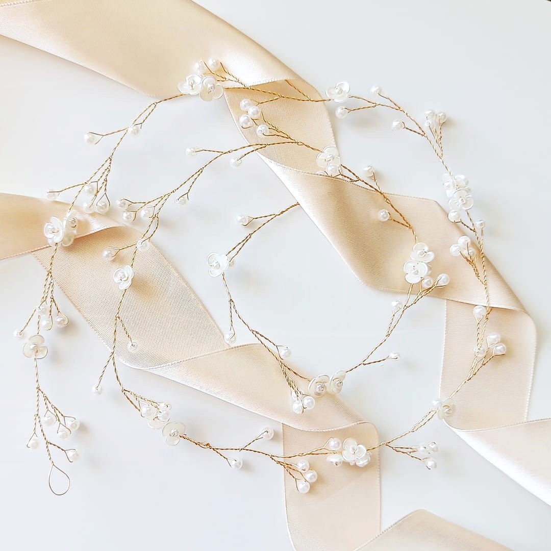 Jemný dlouhý věnec do vlasů čelenka s květinami a zlatými perlami