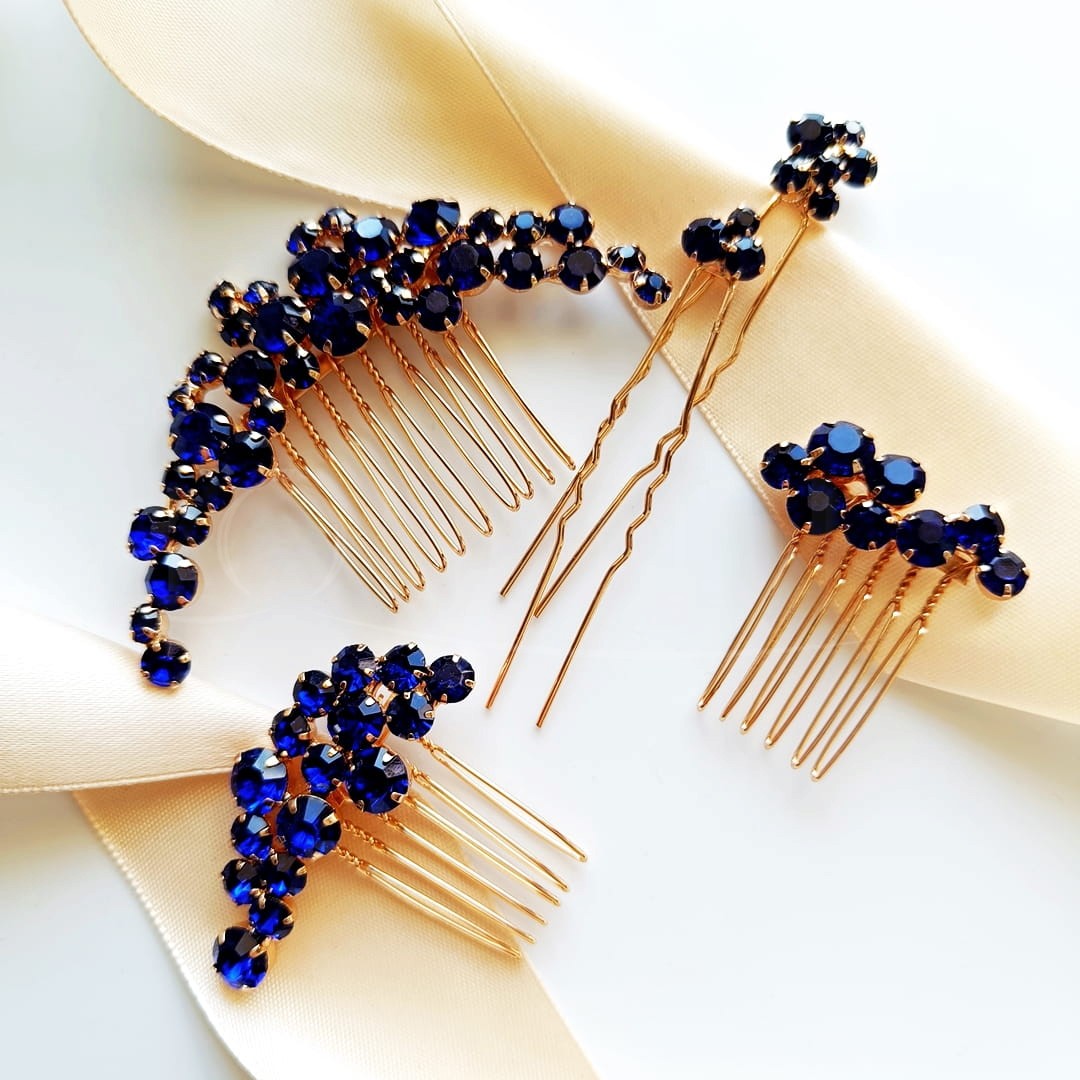 Krásná a elegantní sada modrých ozdob do vlasů ve zlatém provedení s úspěchem dodá lesk efektnímu svatebnímu účesu a nejen jemu. Sada se skládá ze tří hřebínků různých velikostí a dvou sponek, které se krásně doplňují. S těmito ozdobami můžete klidně budovat efekt použitím pouze jednoho hřebínku, nebo vytvořit úžasnou konstrukci s použitím celé sady.