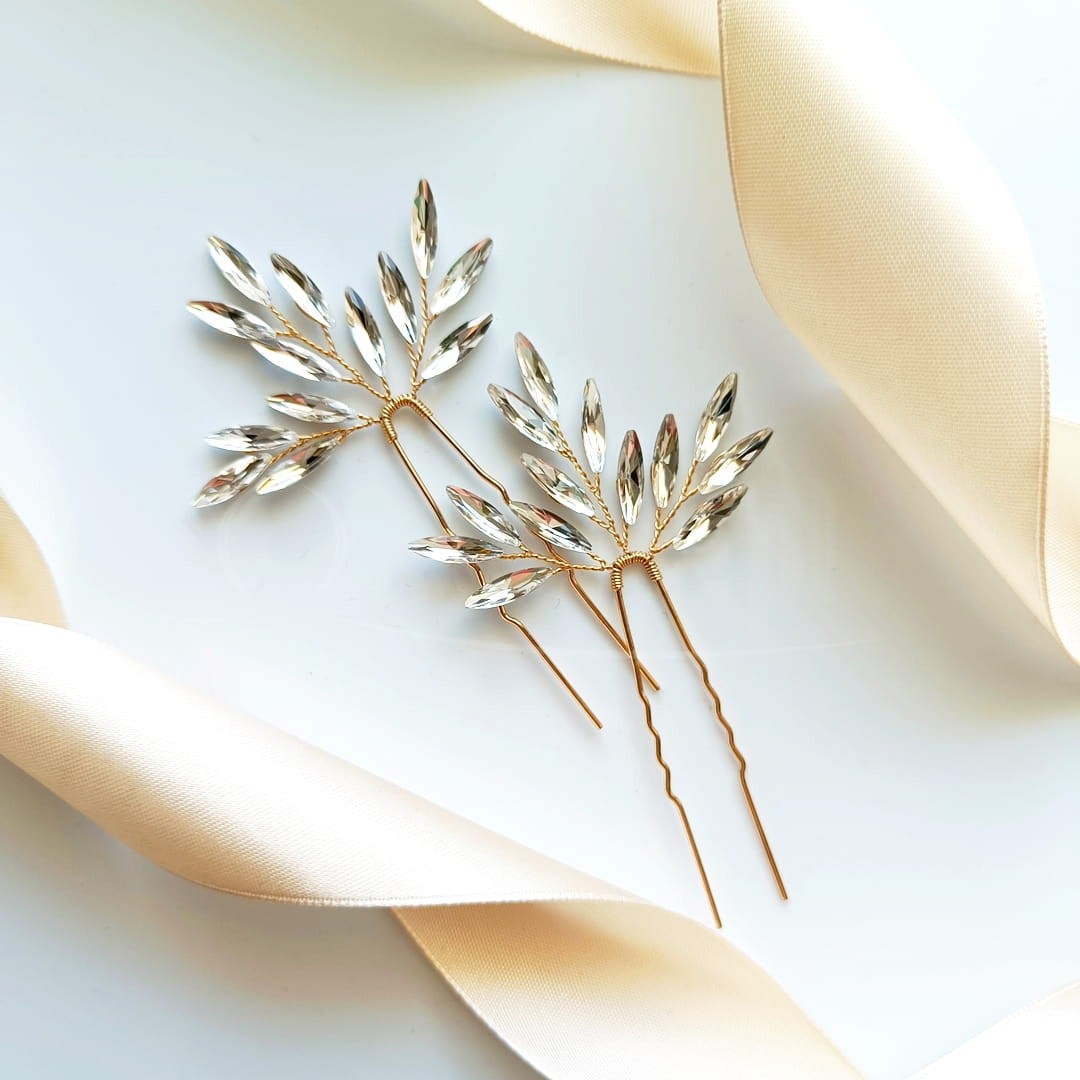 Dovedně zvolená ozdoba do vlasů tvoří souvislý celek a zdůrazňuje eleganci svatebního stylingu. Tento třpytivý duet zlatých šperkových sponek bude jistě viditelný a dodá charakter každému účesu.