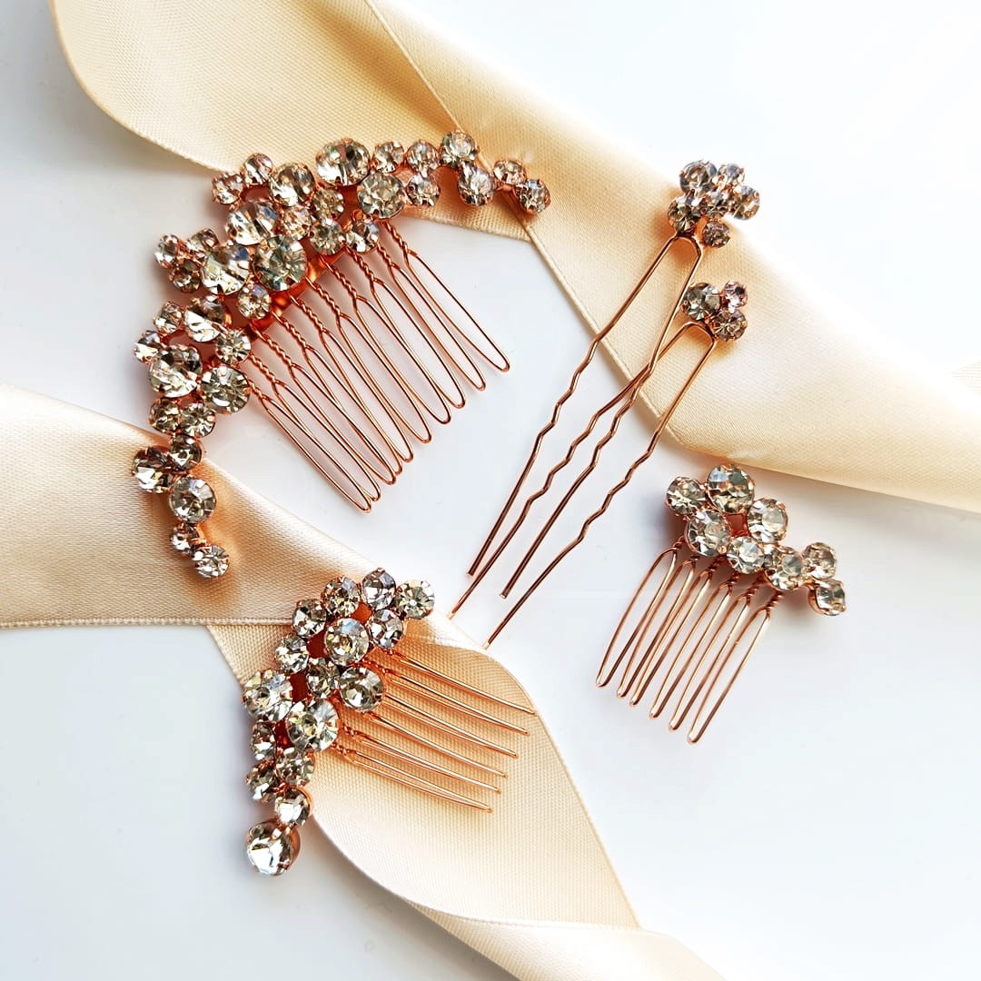 Růžové zlato sestava elegantních ozdob do vlasů se zirkony ve stylu glamour