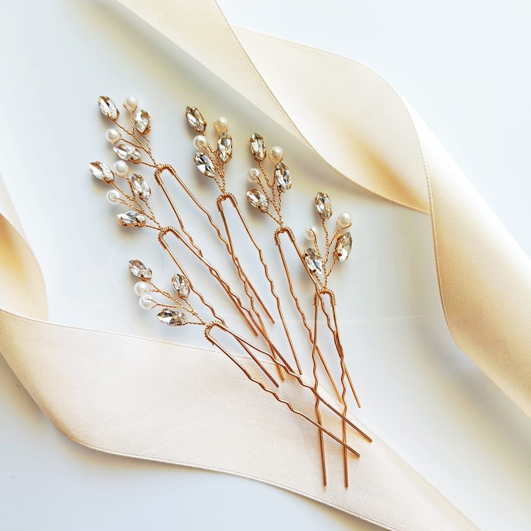 Ozdobné sponky do vlasů ve zlaté barvě dodají lesk stylingu. Perličky zpestřují celou kompozici a zdůrazňují jejich třídu.