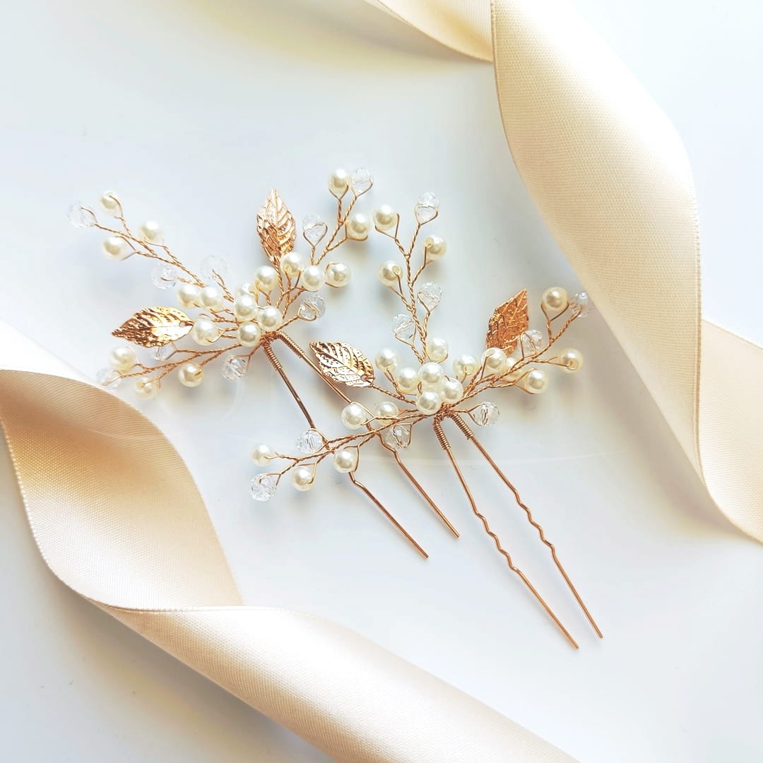 Představujeme další sadu ozdob do vlasů - tentokrát jsou to dvě sponky s perličkami, krystalky a lístky ve zlaté barvě. Ozdoba se bude krásně vyjímat jak zapíchnutá na jednom místě jako výraznější ozdoba např. k nesymetrickému účesu, tak i na dvou místech, čímž vytvoří prostorovější kompozici, např. k rozpuštěným fantazijním loknám nebo poloúčesům.