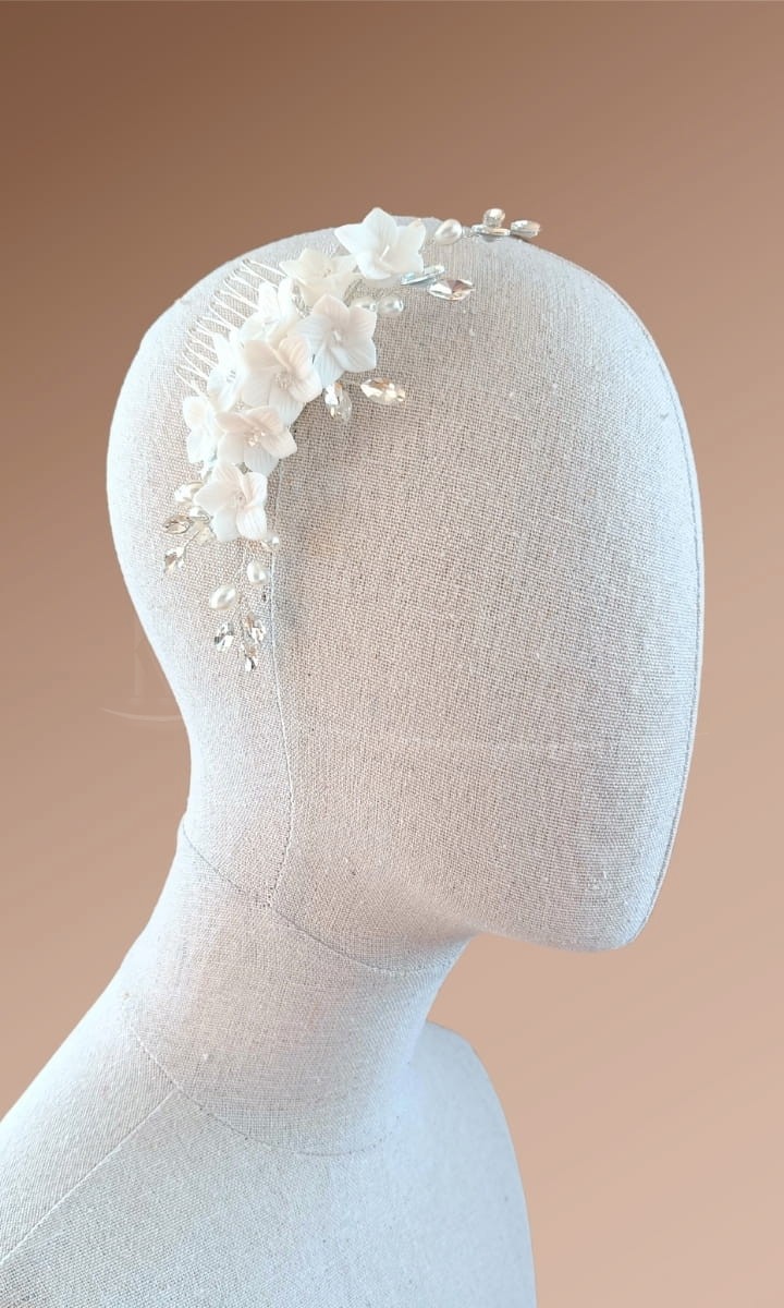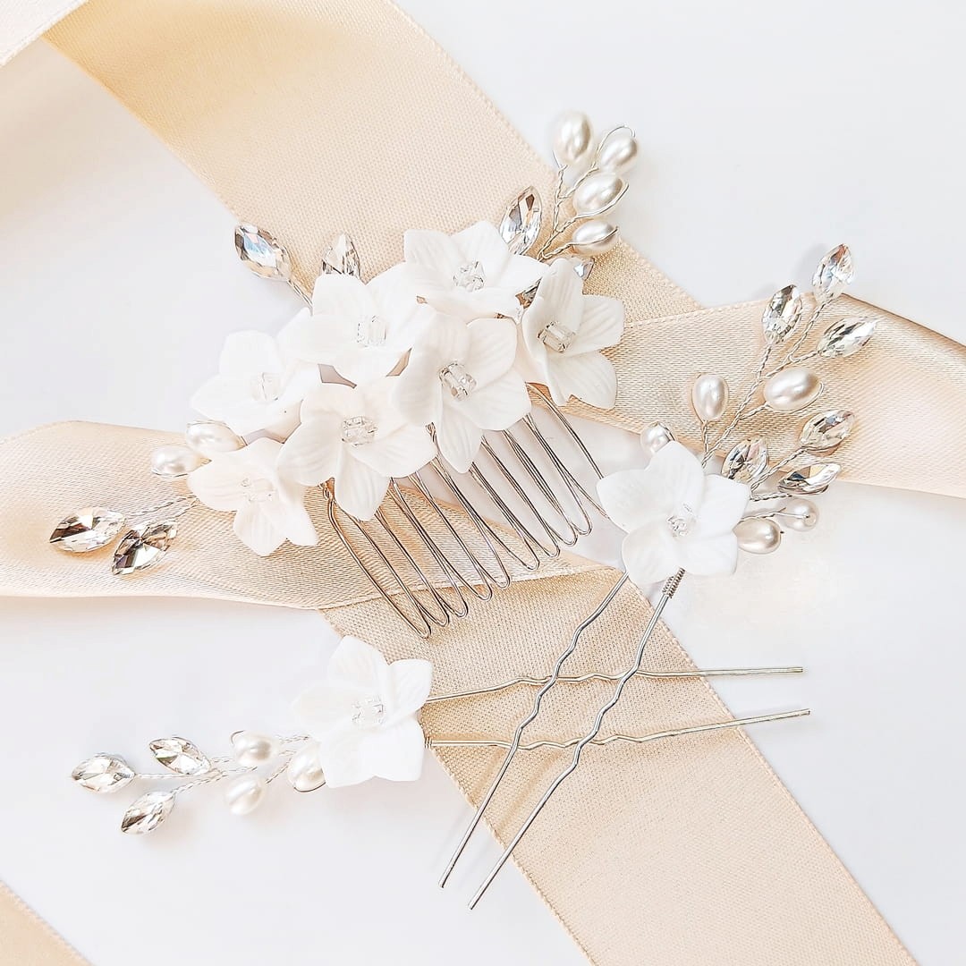 Tento krásný květinový stříbrný komplet ozdob do vlasů dokonale doplní tvůj svatební outfit. Květiny z hlíny jsou odolné a nevadí jim žádné povětrnostní podmínky, a v doprovodu perel a zirkonů vypadají velmi noblesně a elegantně.
