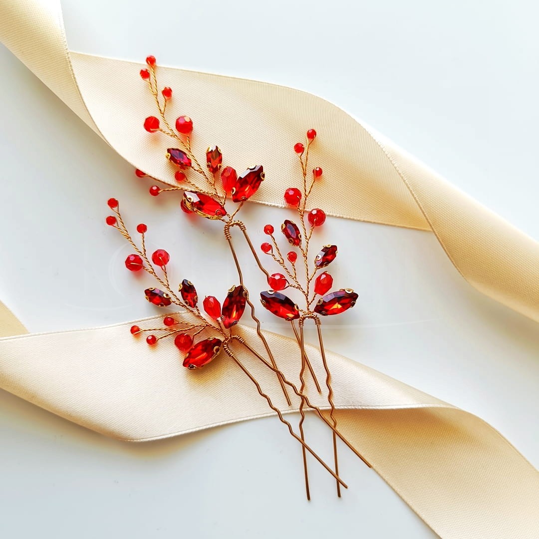 Viditelná, ale jemná červená ozdoba do vlasů, jejíž efekt lze stupňovat v závislosti na stylu účesu? S těmito šperkovými červenými sponkami je to možné! Můžete si vybrat jednu, dvě nebo tři, abyste dosáhli požadovaného efektu. Je to skvělá alternativa ke všem hřebínkům nebo sponkám, protože se sponkami dosáhnete přesně toho, co si naplánujete. Ohebné drátky, ze kterých jsou větvičky vyrobeny, si můžete upravit podle své vize.