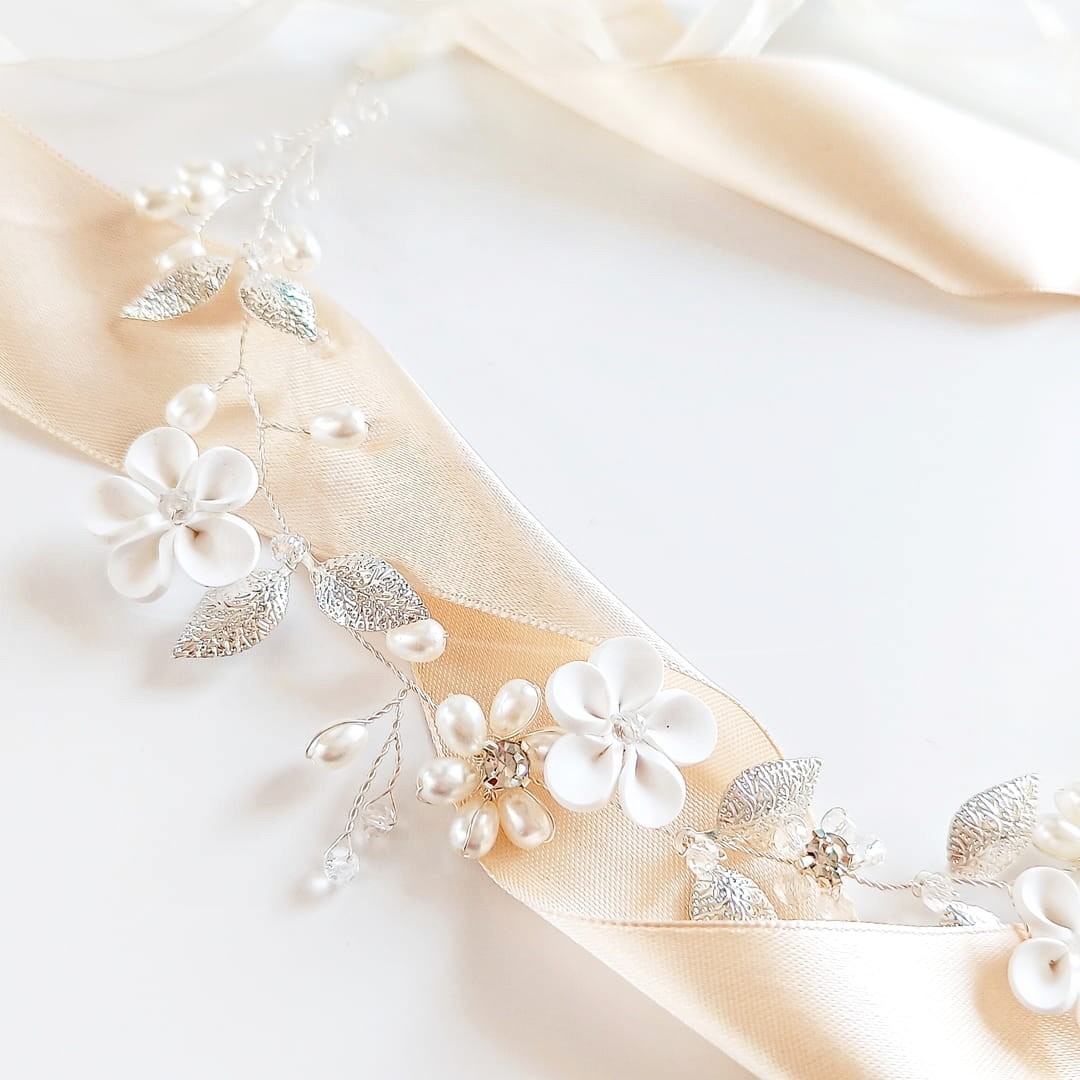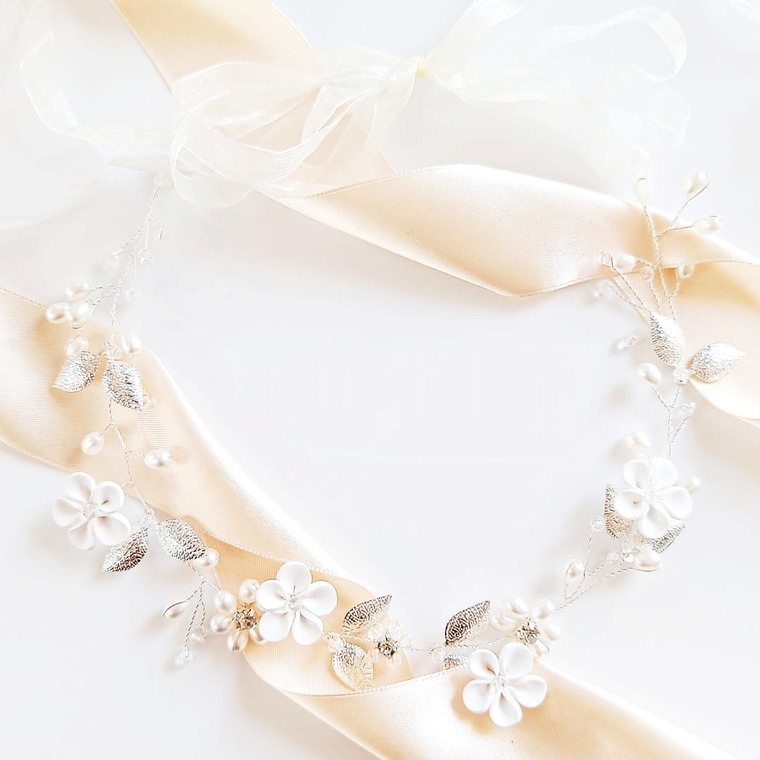Jemný, ale viditelný - taková je stříbrná ozdobná čelenka, kterou máte před sebou. Jemné květiny se tu prolínají s listy a perličkami, vytvářejíc estetickou rustikální kompozici. Elastický drátek si přizpůsobíte podle svých potřeb a ozdobnou stuhu můžete sundat, abyste ji použili jako věnec jako girlandu na svatební cop.