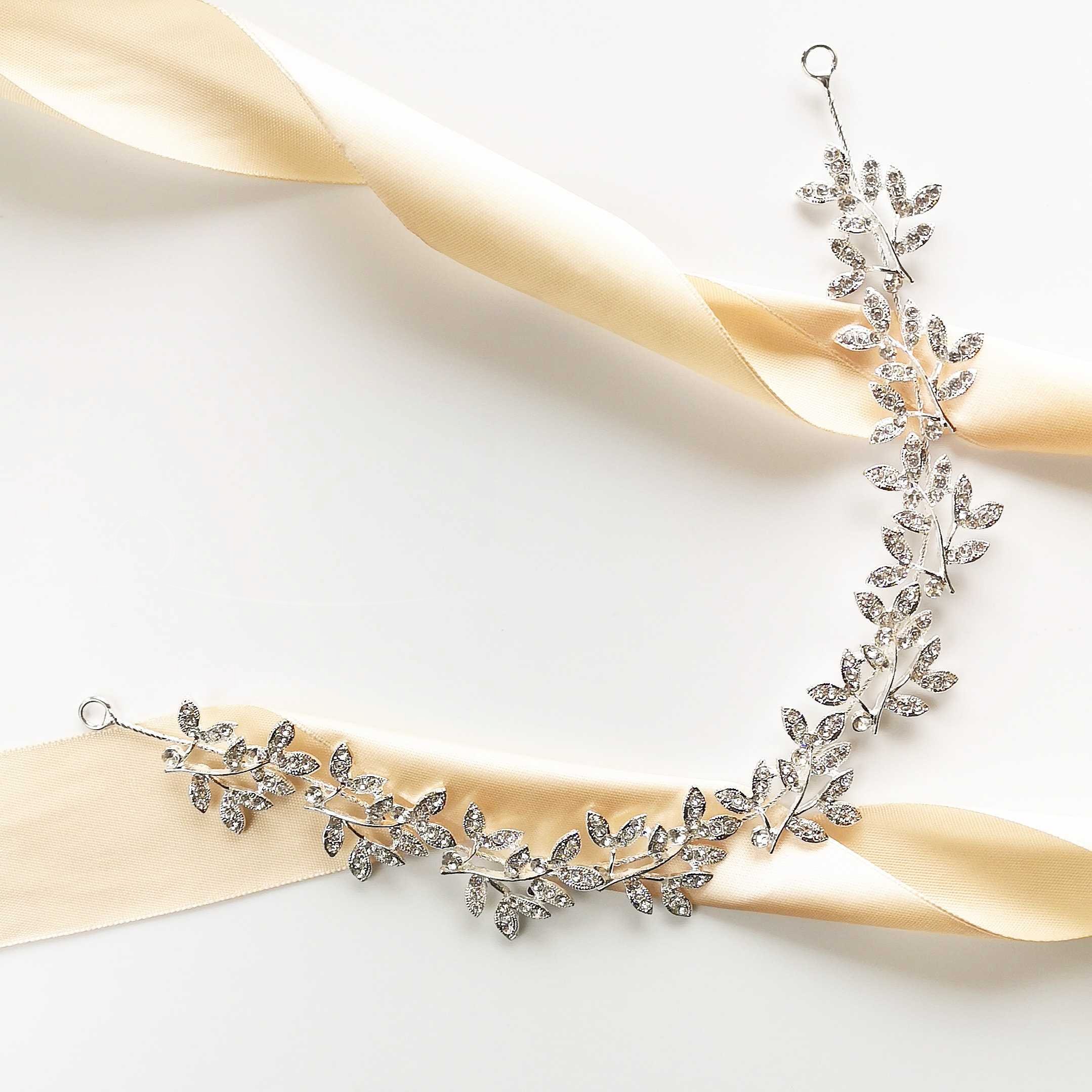 Svatební pásek do vlasů ve formě větvičky, díky elastickému drátku se přizpůsobí každé svatební úpravě a krásně ji zdobí – můžete si ho nasadit jako pásku, a také ji můžete kolem culíku zakroužit, vytvářejíc složitou svatební kompozici.