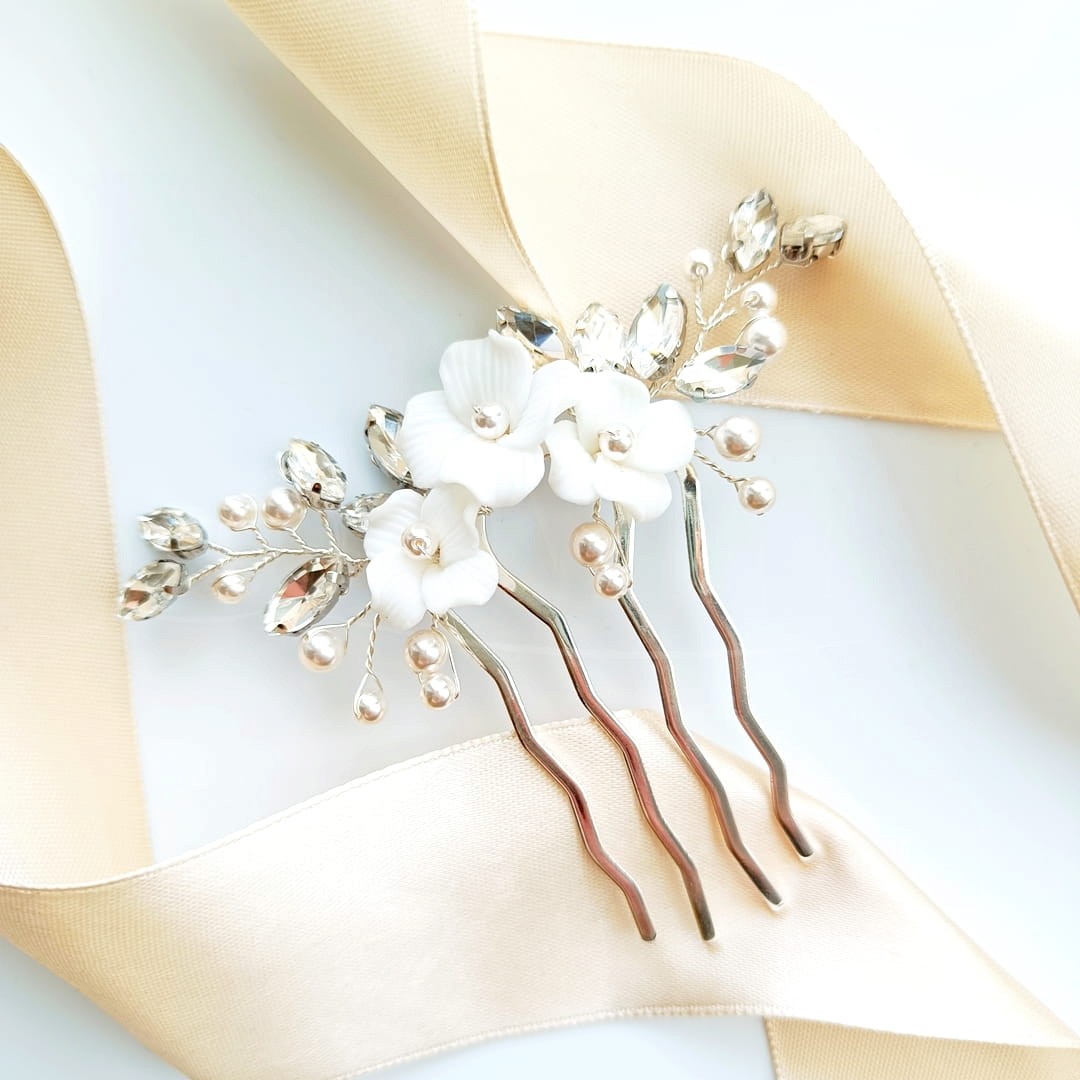 Stříbrný hřebínek s květinami z polymerové hmoty, perlami a zirkony