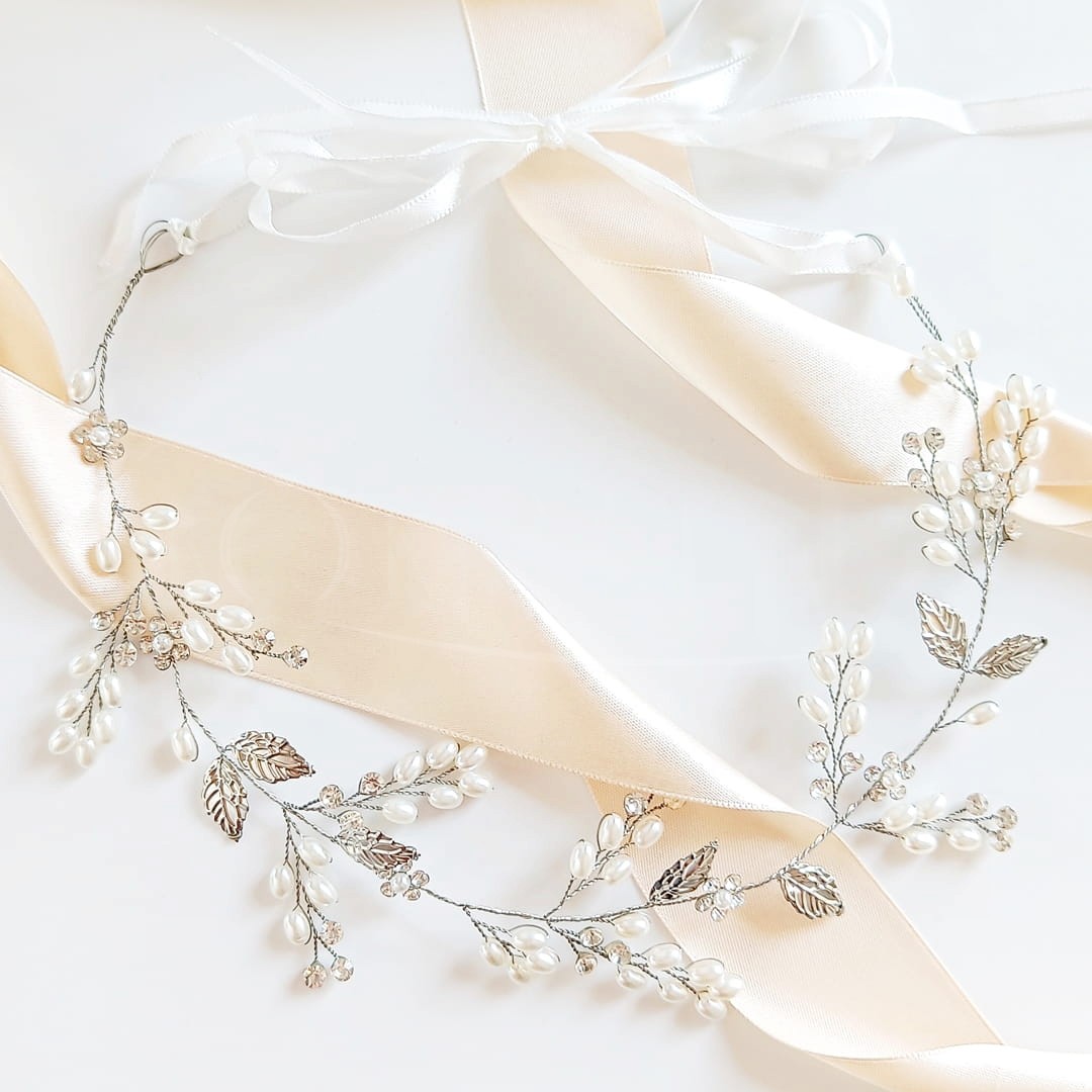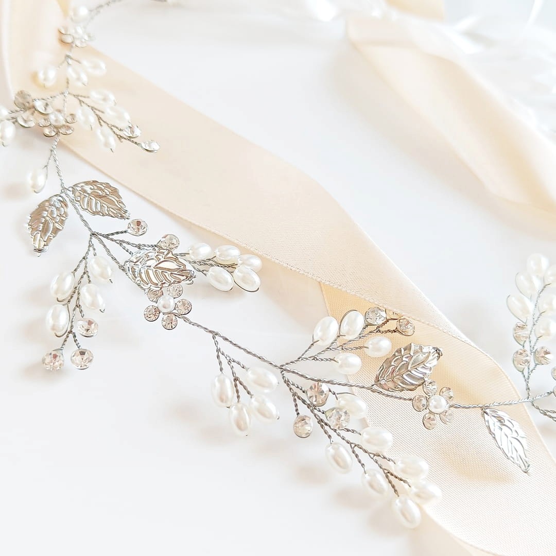 Stříbrný bižuterní věneček s lístky a perlami je volbou nevěst v rustikálním stylu. Květiny a lístky se přirozeně hodí k tomuto stylu, takže ozdoba bude krásně ladit s volnými jemně vlněnými prameny.
