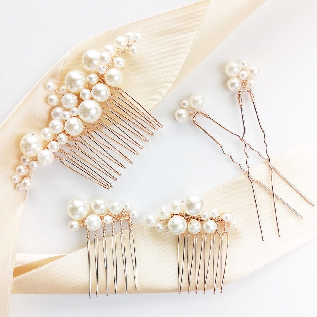 Sada svatebních ozdob do vlasů, kde hlavním motivem jsou perličky, skvěle poslouží jak pro složitější účesy, tak pro volnější účesy. Díky několika prvkům, které tvoří sadu, můžete perličky libovolně umisťovat ve vlasech a vytvářet zajímavé kompozice.