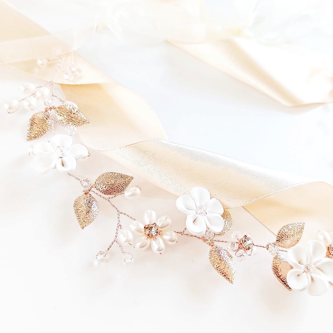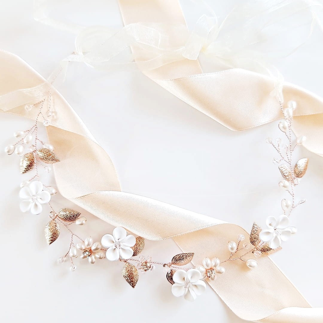 Věnec z růžového zlata čelenka s květy lístky a perličkami jemný