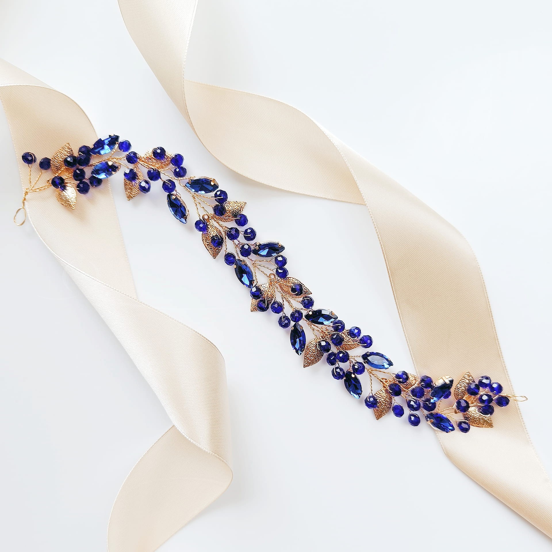 Ozdobná girlanda do vlasů s modrými zirkony propletenými zlatými lístky vypadá ve vlasech velmi elegantně a zdůrazní každý účes. Větvičku můžete libovolně tvarovat díky měkkému drátku.