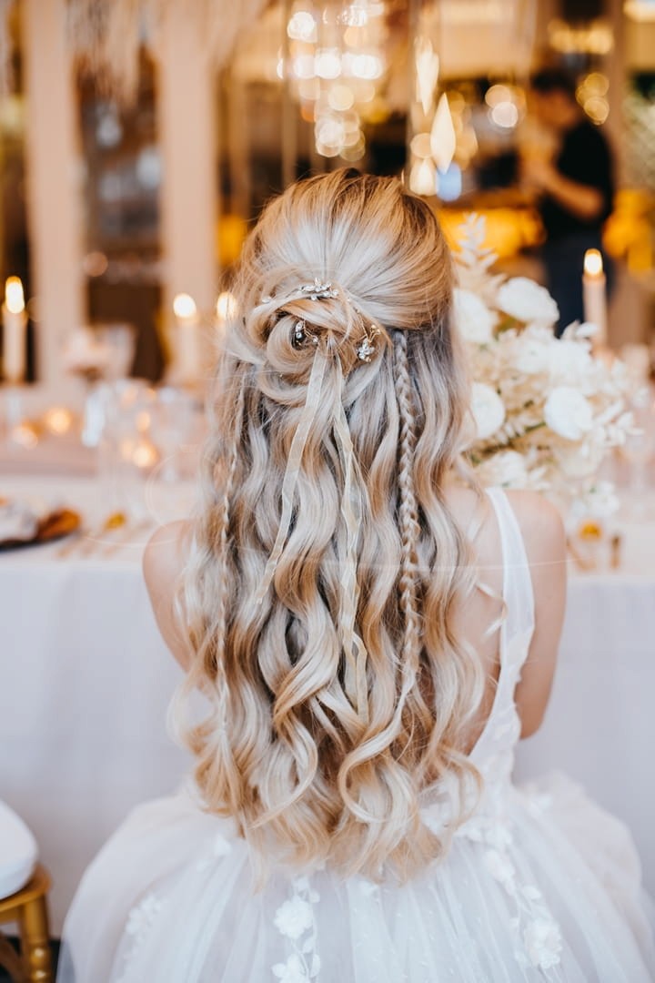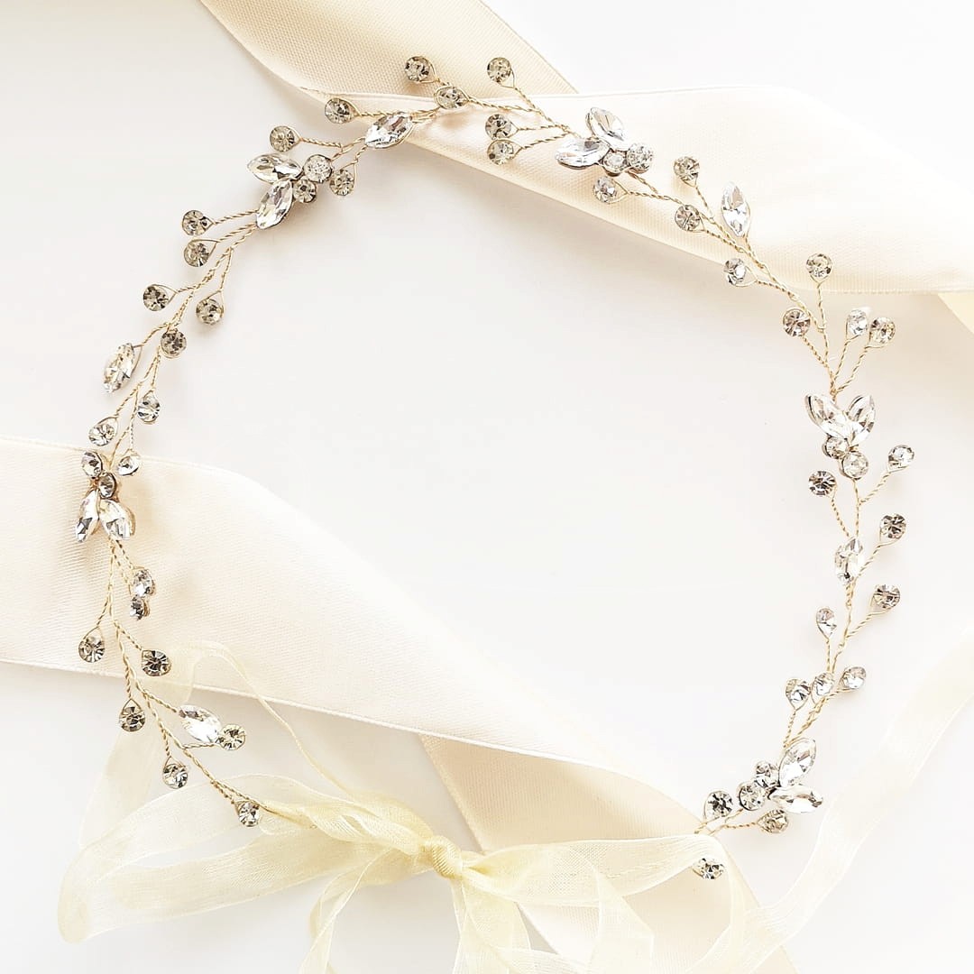 Tento svatební obvaz s ozdobnými aplikacemi z cirkonie ve tvaru lístků je ideálním doplňkem pro nevěsty hledající lesklý, ale ne příliš výrazný svatební doplněk. Cirkonie spletené na ohebném drátku můžete libovolně tvarovat - povolením stuhky získáte možnost vytvoření ozdoby kolem drdolu nebo jiné zajímavé účesy.