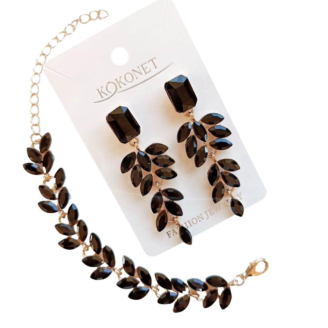 Elegantní zlatý náramek s nastavitelným zapínáním a odpovídajícími náušnicemi jemně spojuje klasiku s moderností. Jemné lístky zdobené černými zirkony dodávají výjimečný lesk, který přitahuje pozornost. Tento šperkový set dokonale doplní jak večerní, tak každodenní stylingy.